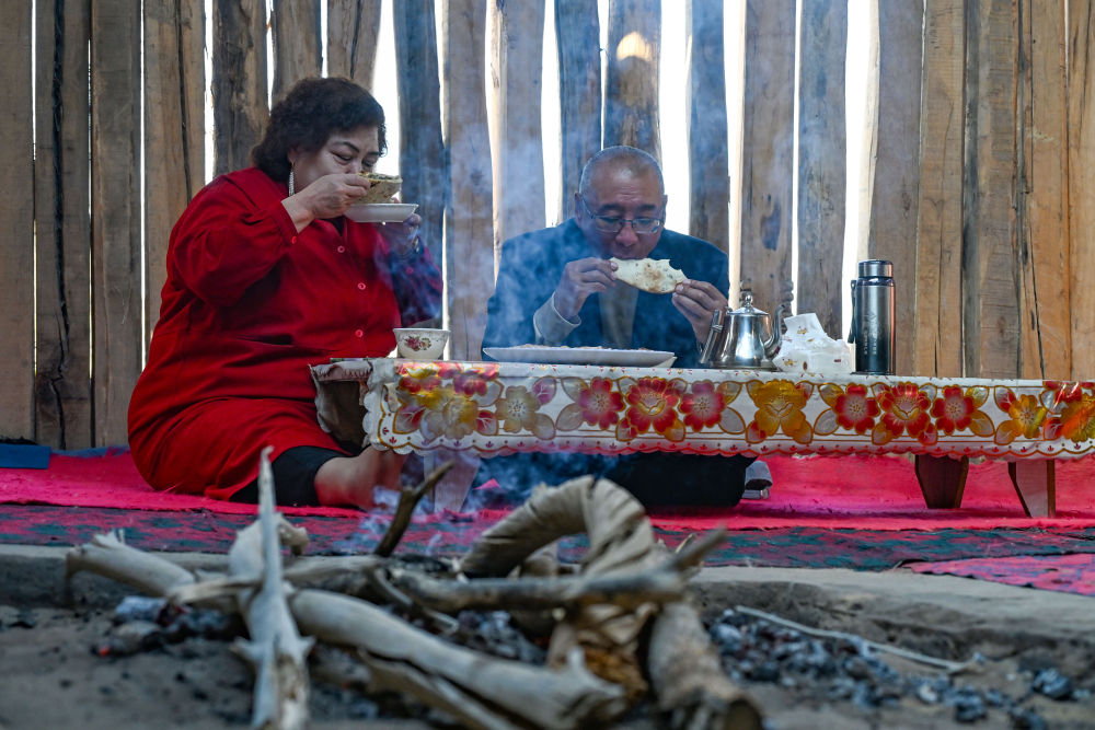 2024年11月9日,在达里雅布依新村一家农家乐内,游客在品尝新鲜出炉的“库麦其”。