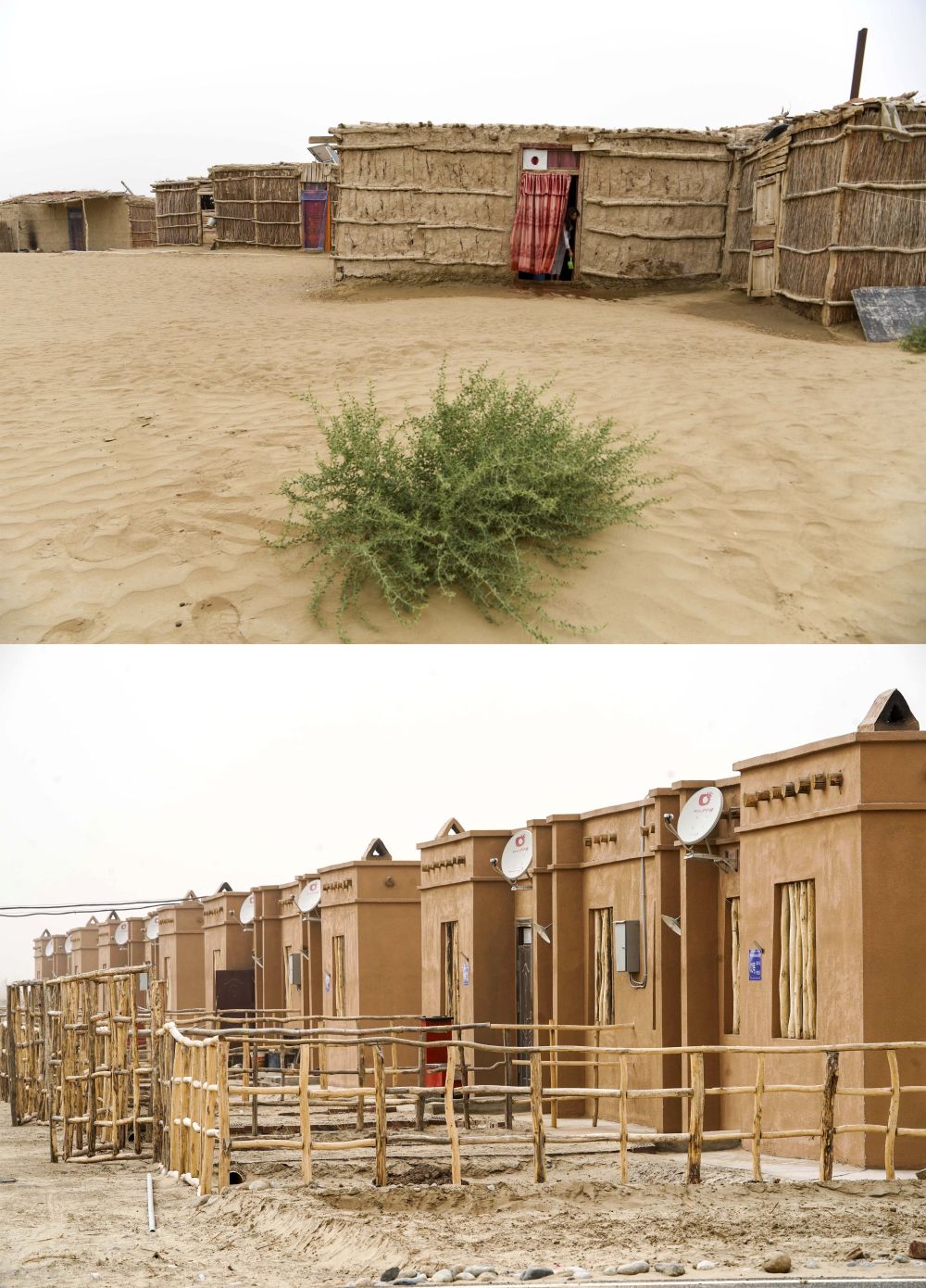 拼版照片:上图为达里雅布依旧址的民居(2018年9月7日摄);下图为达里雅布依新村的房屋(2019年3月20日摄)。