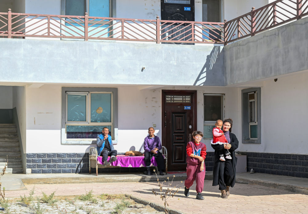 2024年11月9日,在达里雅布依新村,一户人家从自家新房的院子里走出。