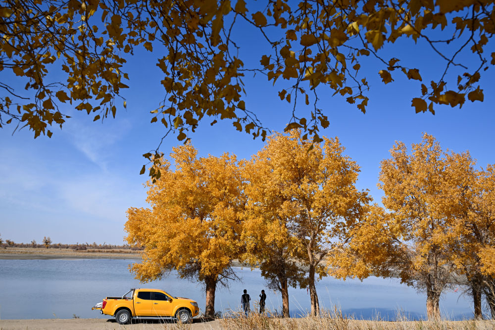 2024年11月5日,人们在达里雅布依旧址景区内克里雅河畔胡杨树下休息。