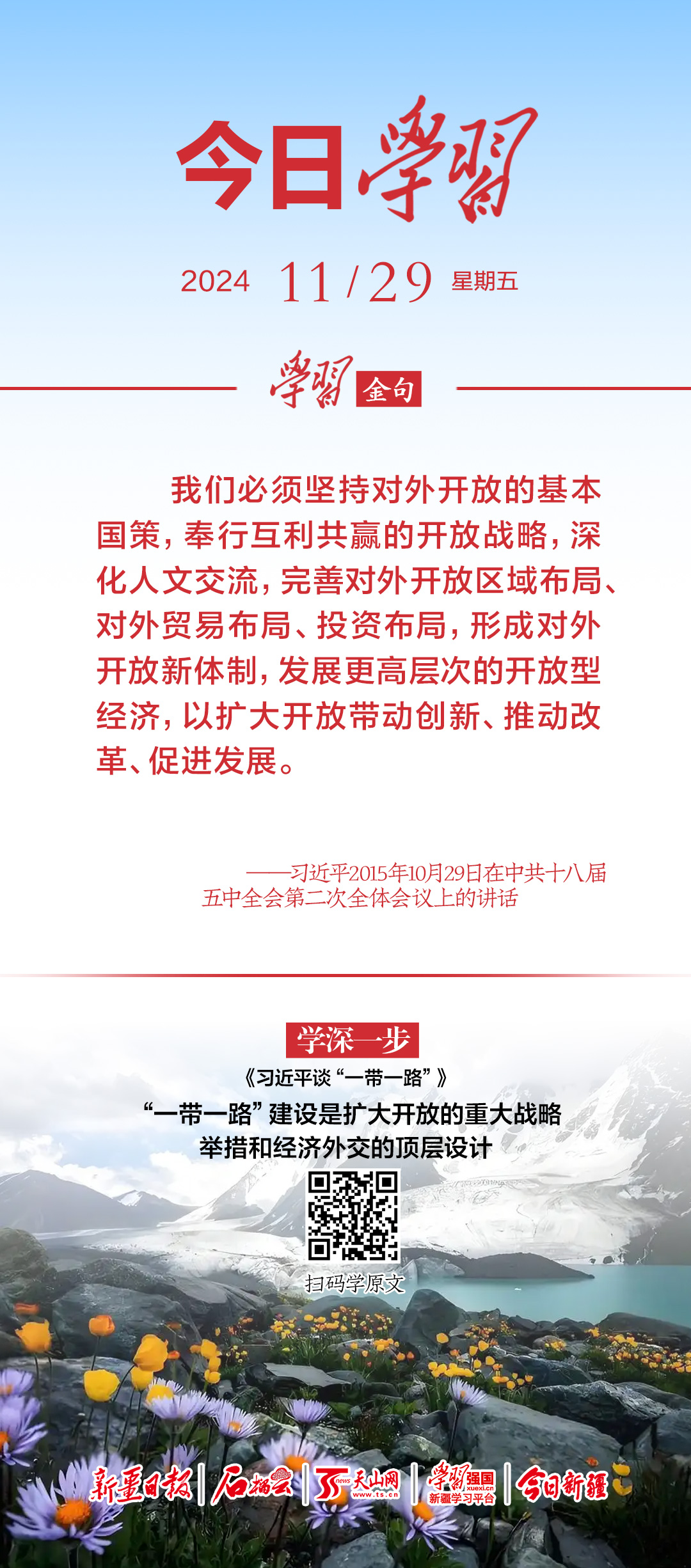 我们必须坚持对外开放的基本国策,奉行互利共赢的开放战略,深化人文交流,完善对外开放区域布局、对外贸易布局、投资布局,形成对外开放新体制,发展更高层次的开放型经济,以扩大开放带动创新、推动改革、促进发展。