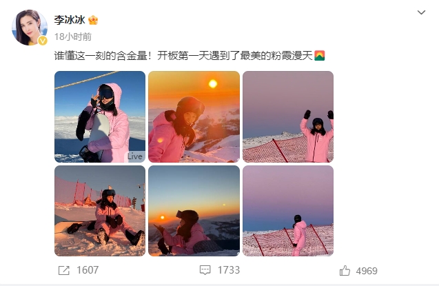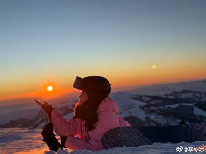 “谁懂这一刻的含金量!开板第一天遇到了最美的粉霞漫天。”11月30日,演员李冰冰在社交媒体上晒在新疆滑雪的图片和视频。