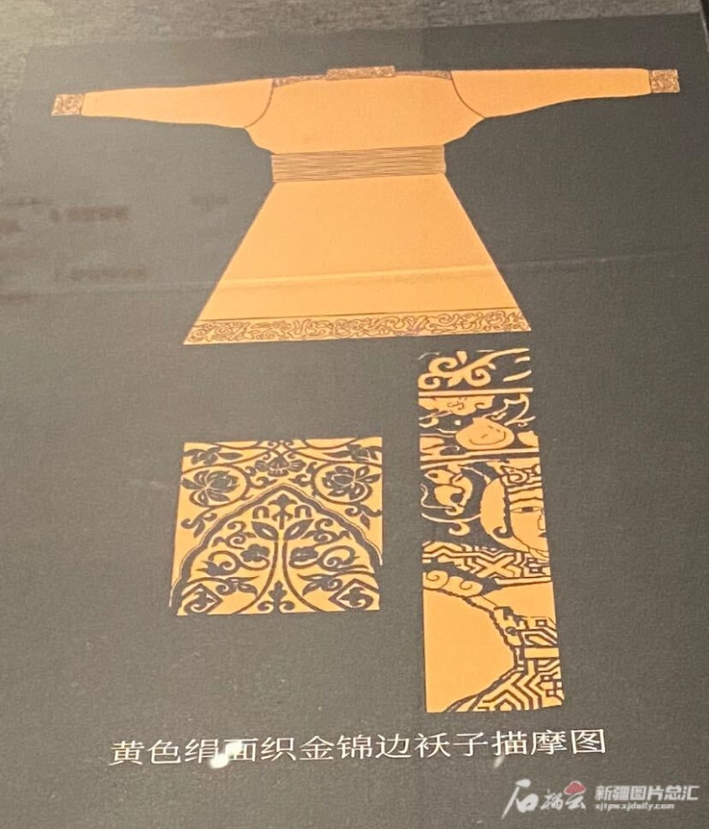 新疆博物馆中的黄色油绢织锦边祆子描摹图。天山网-新疆日报 记者赵梅摄