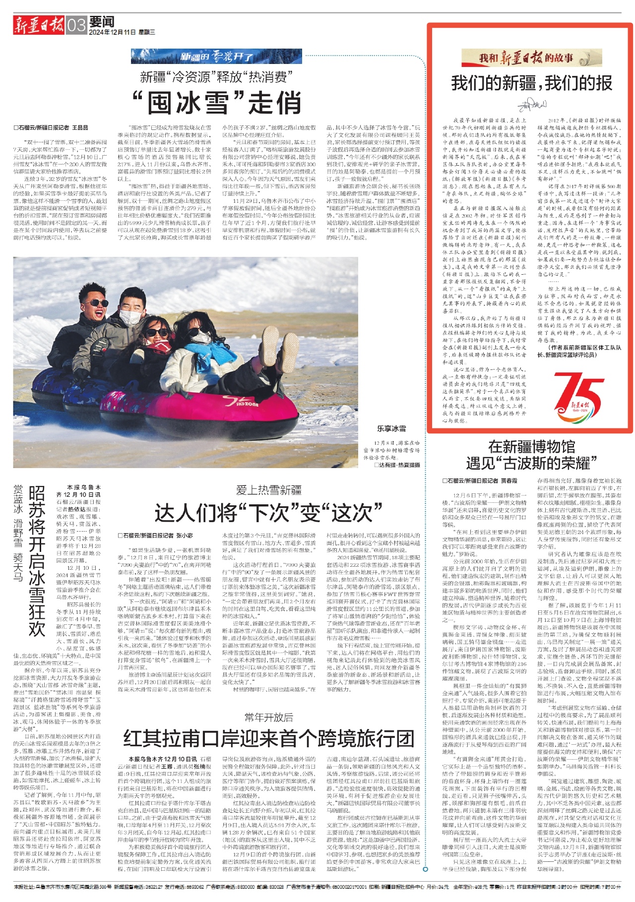 1949年12月6日,人民的《新疆日报》创刊。75年来,新疆日报与共和国风雨同行,与党和人民心心相印,忠诚见证、忠实记录了在中国共产党坚强领导下,新疆的发展与变迁,把新疆各族儿女团结奋进的华彩篇章,镌刻进历史的丰碑。为庆祝这一具有里程碑意义的日子,同时回顾和分享《新疆日报》与广大读者之间的深厚情谊,特举办“我和《新疆日报》的故事”征文活动。