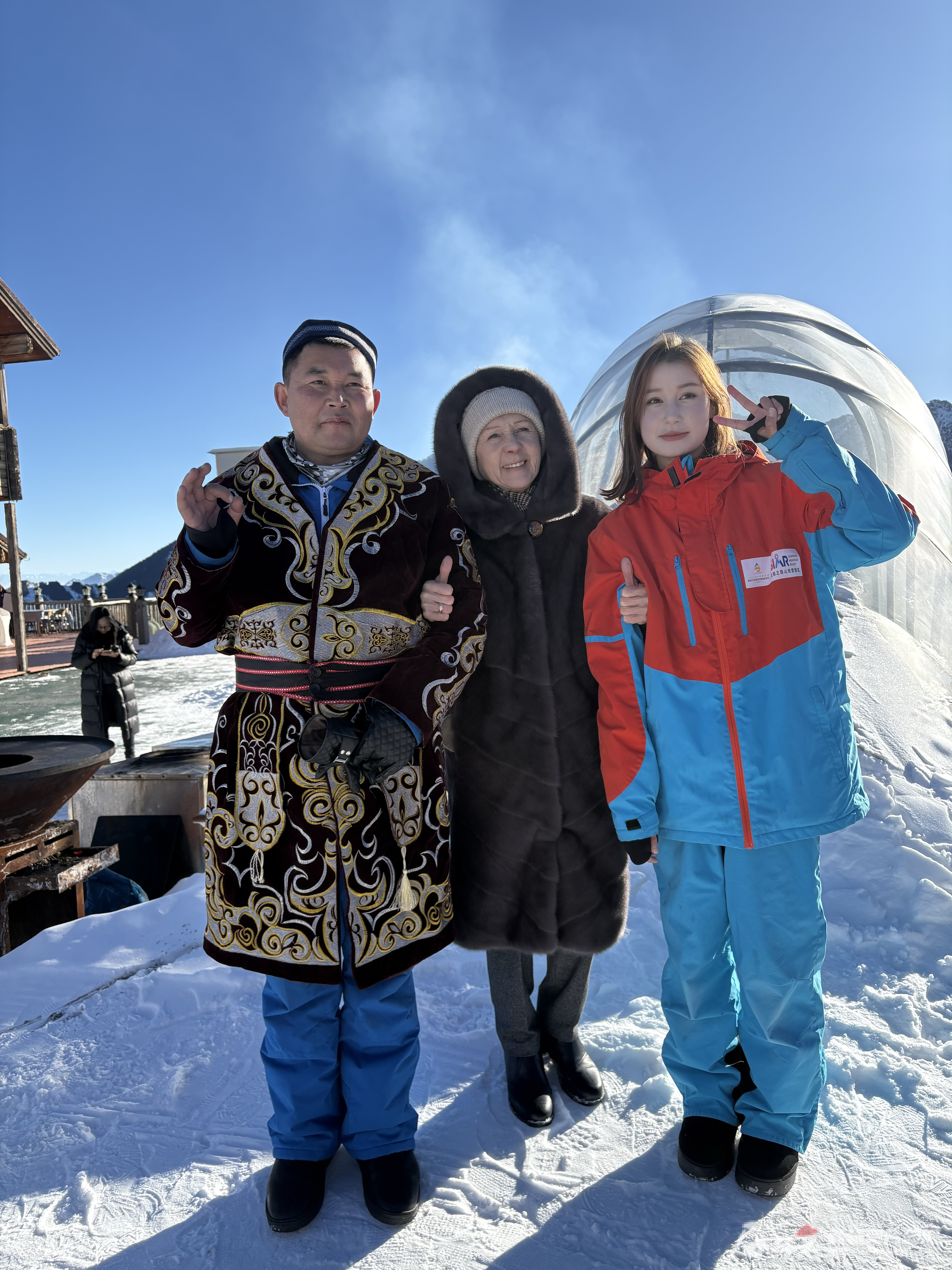 12月13日,吉尔吉斯丝路新观察报总编辑妮娜·尼奇波罗娃(中)在丝绸之路山地度假区,与工作人员合影留念。石榴云/新疆日报记者 王晶晶摄
