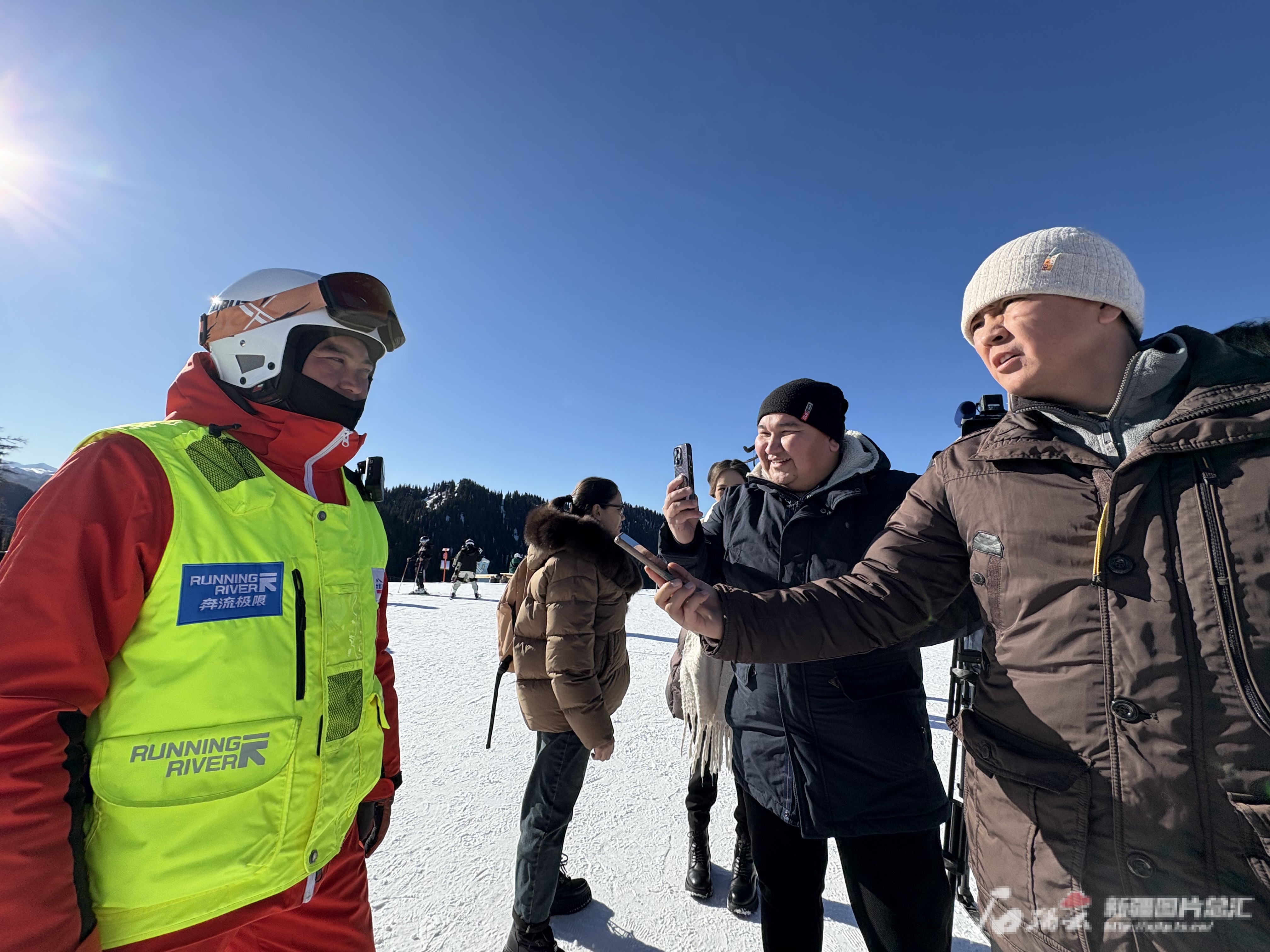 12月13日,“热雪新疆”中外媒体联合采访团在丝绸之路山地度假区,采访救援队员帕尔哈提·胡那皮亚。石榴云/新疆日报记者 王晶晶摄