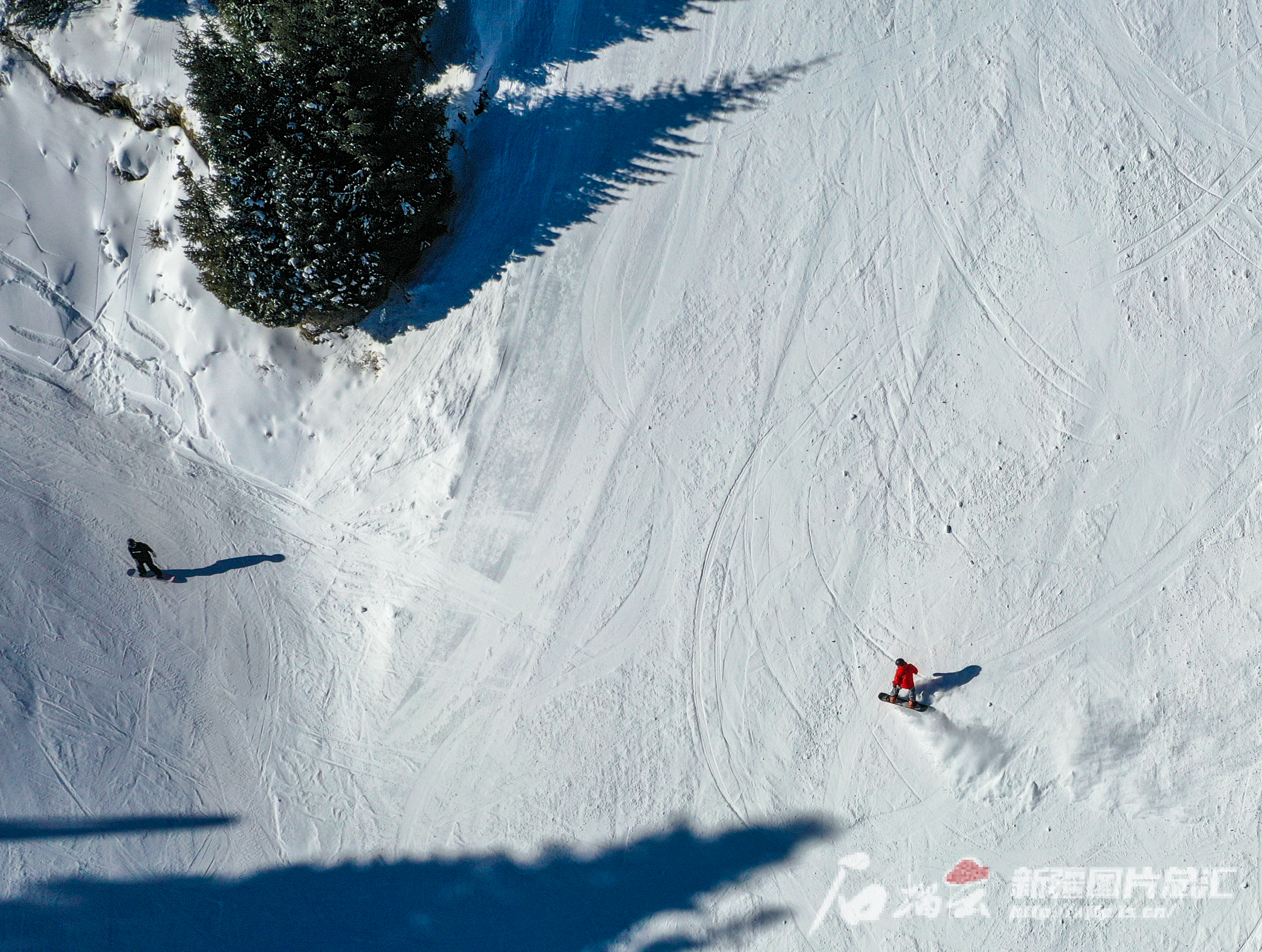 12月13日,游客在位于乌鲁木齐县水西沟镇的丝绸之路山地度假区滑雪(无人机摄)。