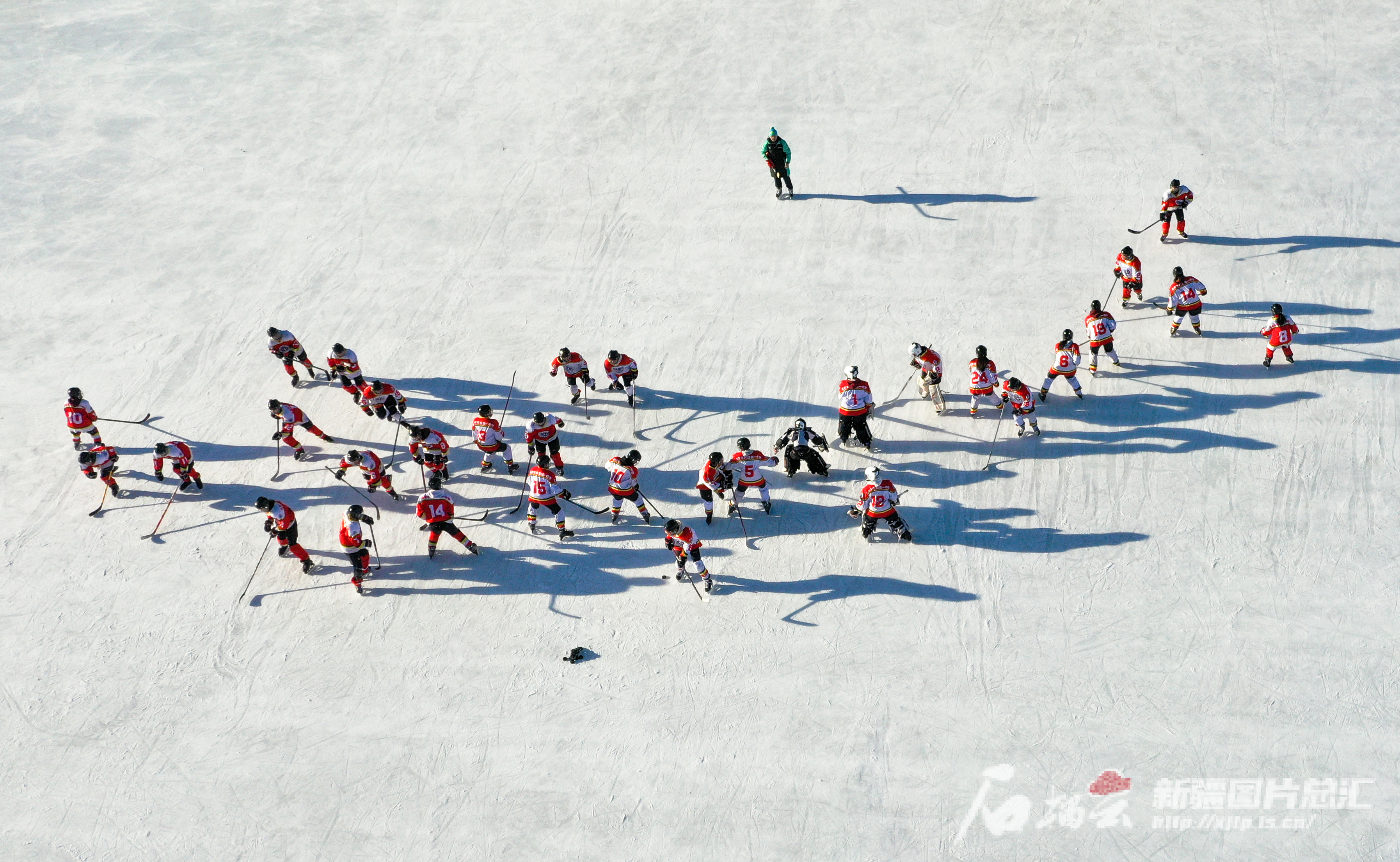 12月13日,乌鲁木齐县第一中学冰球队队员正在训练(无人机摄)。
