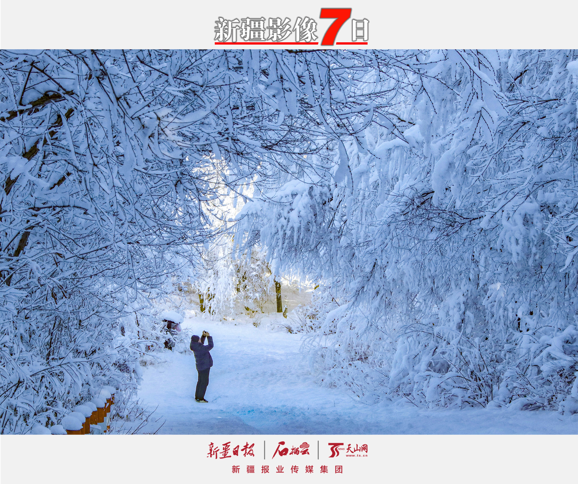 12月12日,游客在乌鲁木齐市雅玛里克山上拍摄雾凇景观。一场大雪过后,乌鲁木齐市雅玛里克山上出现了大面积雾凇景观,银装素裹的树梢上闪烁着晶莹剔透的光芒,宛如玉树琼枝,美不胜收。天山网-新疆日报记者 蔡增乐摄