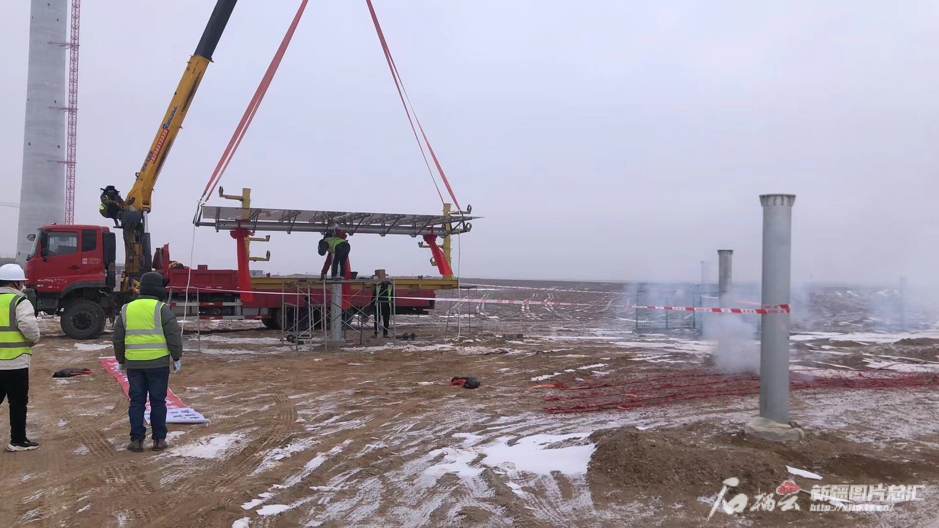 12月24日上午,中国能建哈密“光(热)储”150万千瓦基地项目中的15万千瓦储热型熔盐塔式光热电站吊装首面定日镜场景。唐斌摄