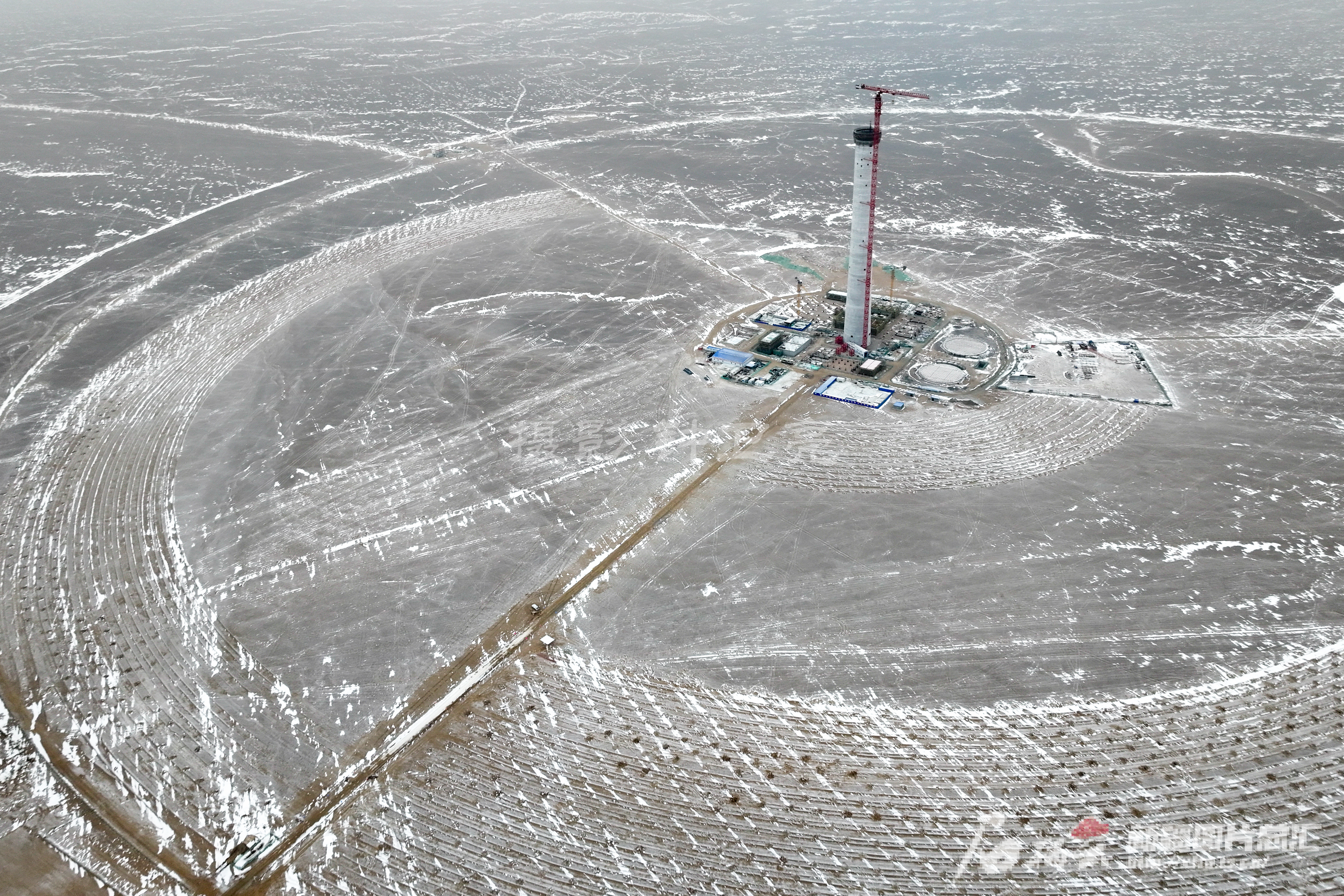 投资建设方资料表明,该电站是目前新疆在建单机容量最大的光热电站。该项目部副总经理周勇介绍,该电站反射太阳光的定日镜总数量为20516面,通过镜面汇集太阳光给吸热塔上的吸热器加热,吸热器吸收太阳能后,将塔顶熔盐管道中的熔盐升温至565℃,之后通过管道储存到熔盐热罐,高温熔盐再通过蒸汽发生系统与水进行热交换产生高品质蒸汽,推动汽轮发电机组发电。
