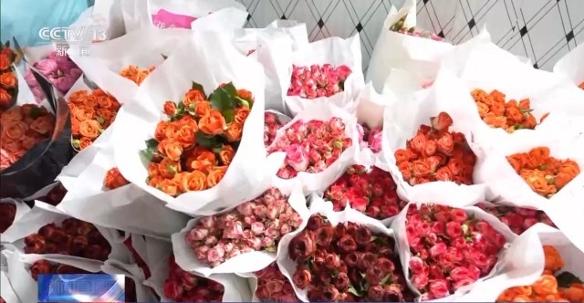 除了花卉市场,花店的生意也火热起来。这家店里摆满了玫瑰、康乃馨,巧妙的搭配,创意的造型,营造出新年的氛围,销售量也大幅上涨。