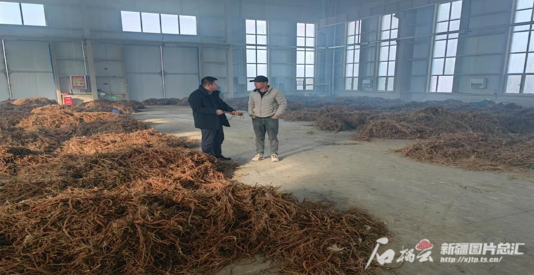 银行工作人员(左一)走进农户的库房实地了解甘草采挖情况。李智强 摄