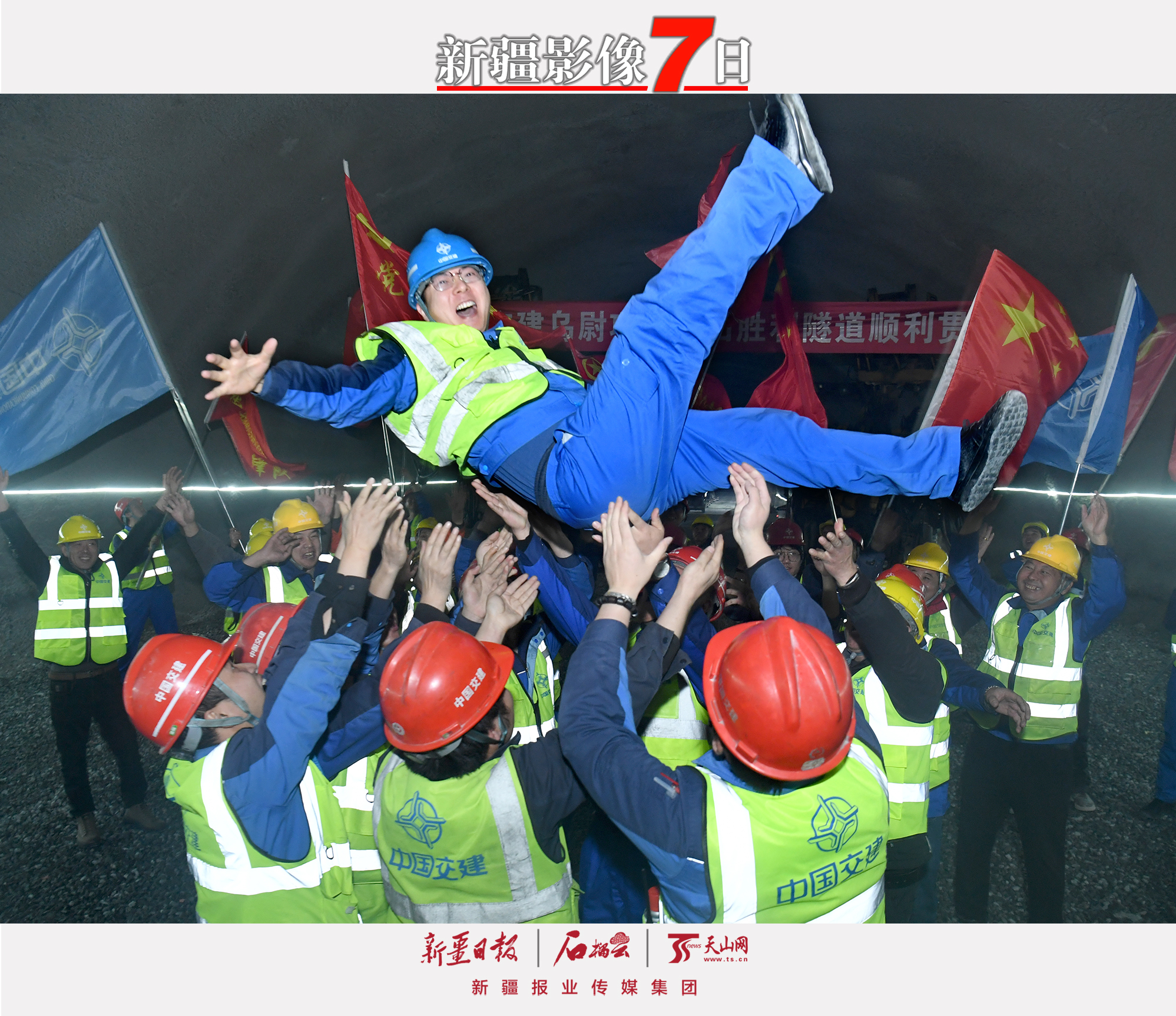 2024年12月30日,实施天山胜利隧道双向对打的施工人员将工友抛起庆祝隧道贯通。当日,世界上在建最长高速公路隧道——G0711线乌鲁木齐至尉犁高速公路天山胜利隧道贯通。天山网-新疆日报记者 韩亮 摄