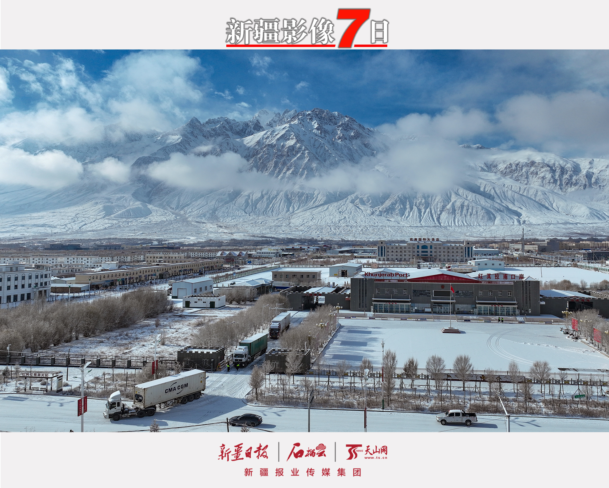 中巴跨国运输车辆从红其拉甫口岸入境(2025年1月3日无人机摄)。新年伊始,新疆出入境边防检查总站红其拉甫出入境边防检查站不断提升服务水平,确保口岸通关高效顺畅。据统计,2024年该口岸出入境人员超6.4万人次,创历史新高。张楠 摄