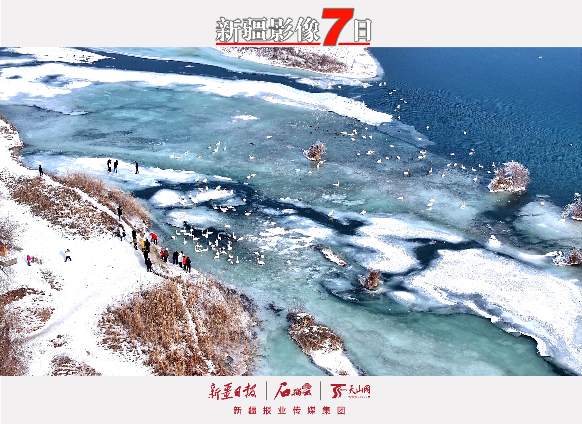 2025年1月1日,游人在流经新疆生产建设兵团第二师21团开都河段的天鹅湾,近距离观赏天鹅。谢江林 摄