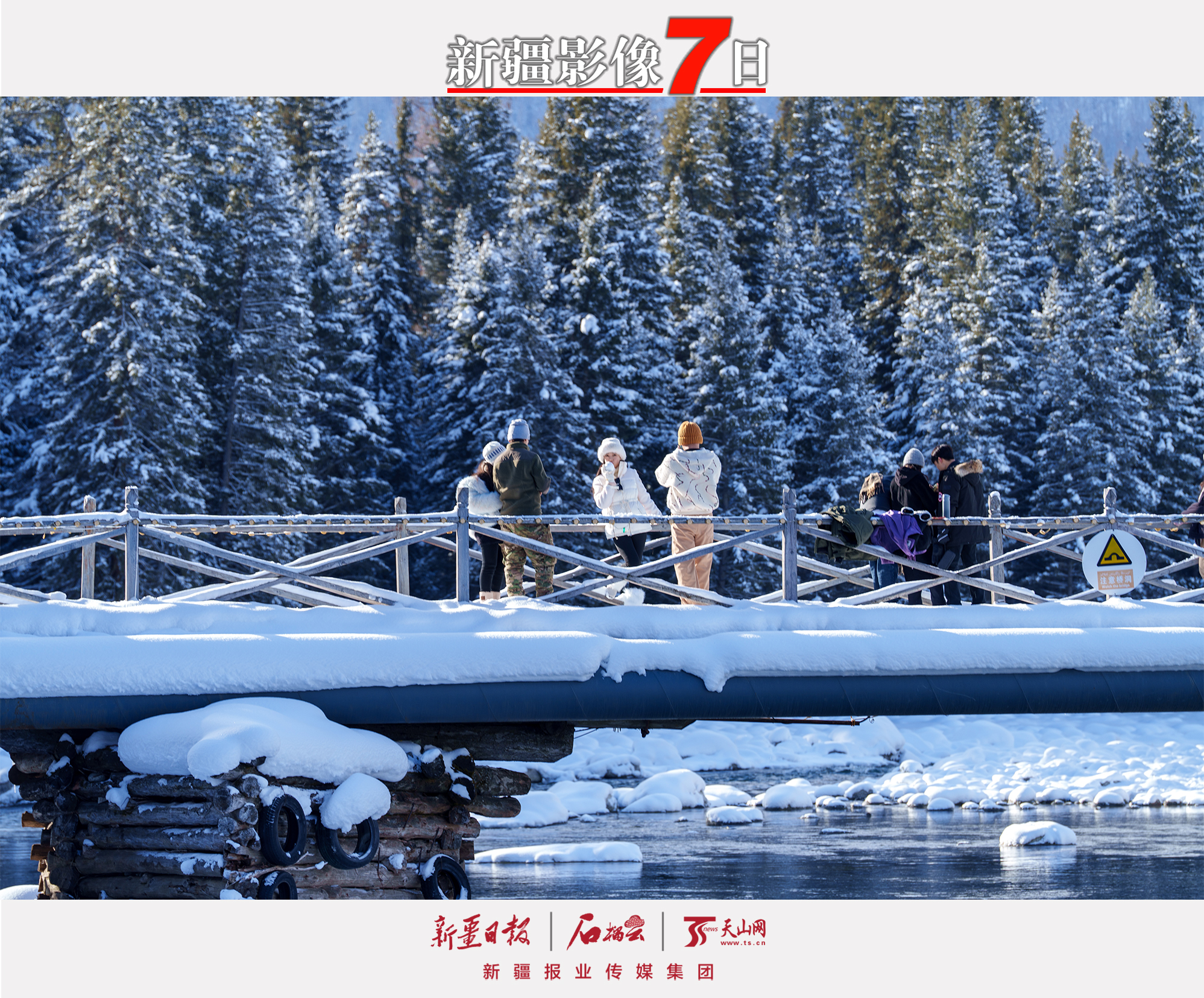 2025年1月3日,游客在布尔津县喀纳斯景区拍照。冬日时节,喀纳斯景区宛如童话世界。皑皑白雪覆盖下的山峦、森林与湖泊,构成了一幅幅动人心魄的绝美画卷,吸引了无数游客争相前来游玩打卡。赵桂锐 摄