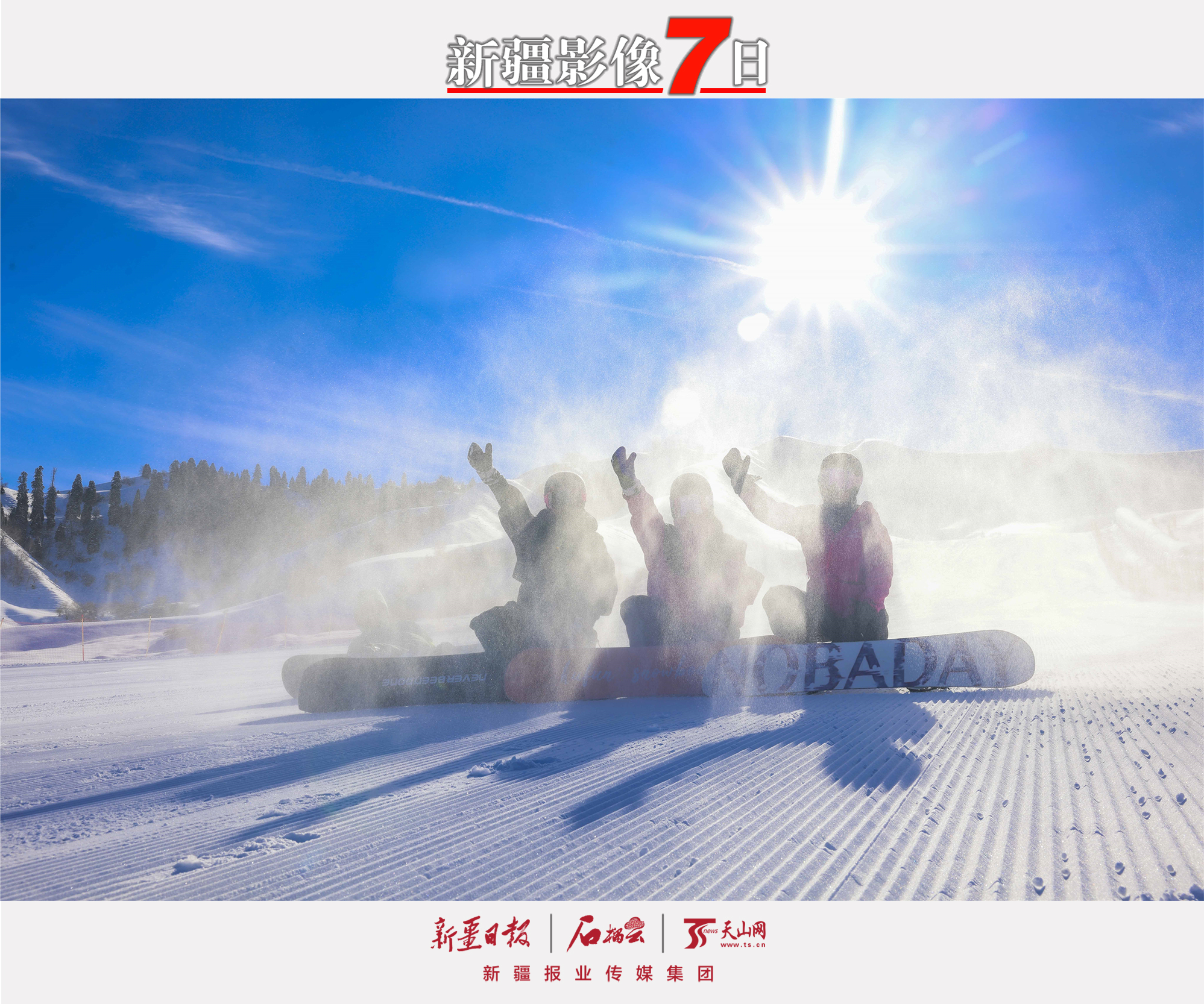 2024年12月30日,雪友在那拉提哈茵赛滑雪度假区利用雪板板刃把雪道上的雪铲起,形成一道“呲雪墙”。张文庭 摄