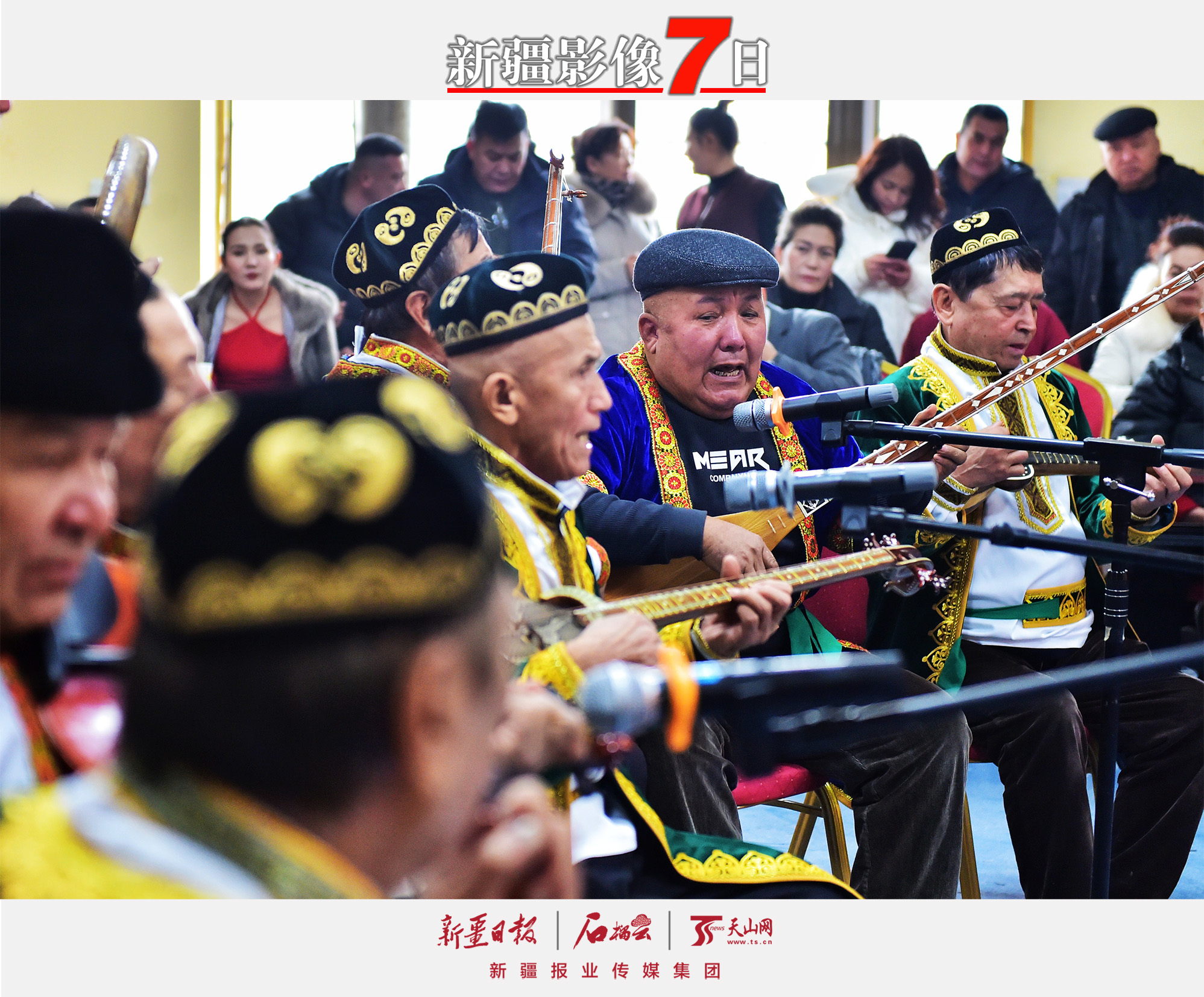 2024年12月30日,活动现场,村民在表演赛乃姆弹唱。当日,在库尔勒市兰干乡文化活动中心,兰干乡贡拉提村300多名村民欢聚一堂,载歌载舞迎元旦。天山网-新疆日报记者 王立华摄