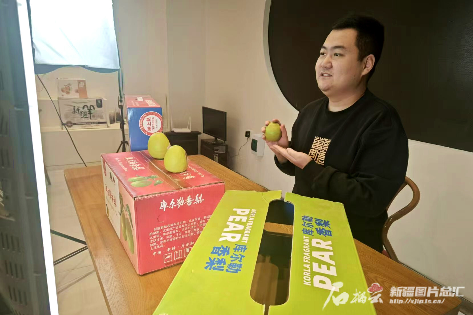 1月6日,在库尔勒市电商双创孵化基地,新疆戈壁农哥农业科技有限公司的主播热情地向网友推介库尔勒香梨。记者 杜建辉摄