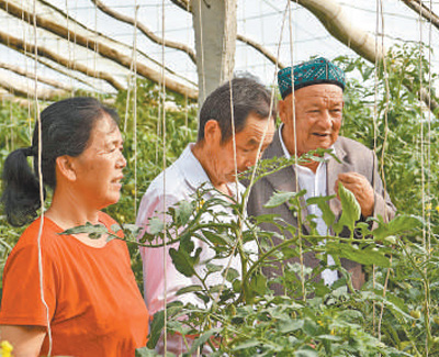沙吾尔·芒力克(右一)和村民交流蔬菜种植经验。白佳丽摄