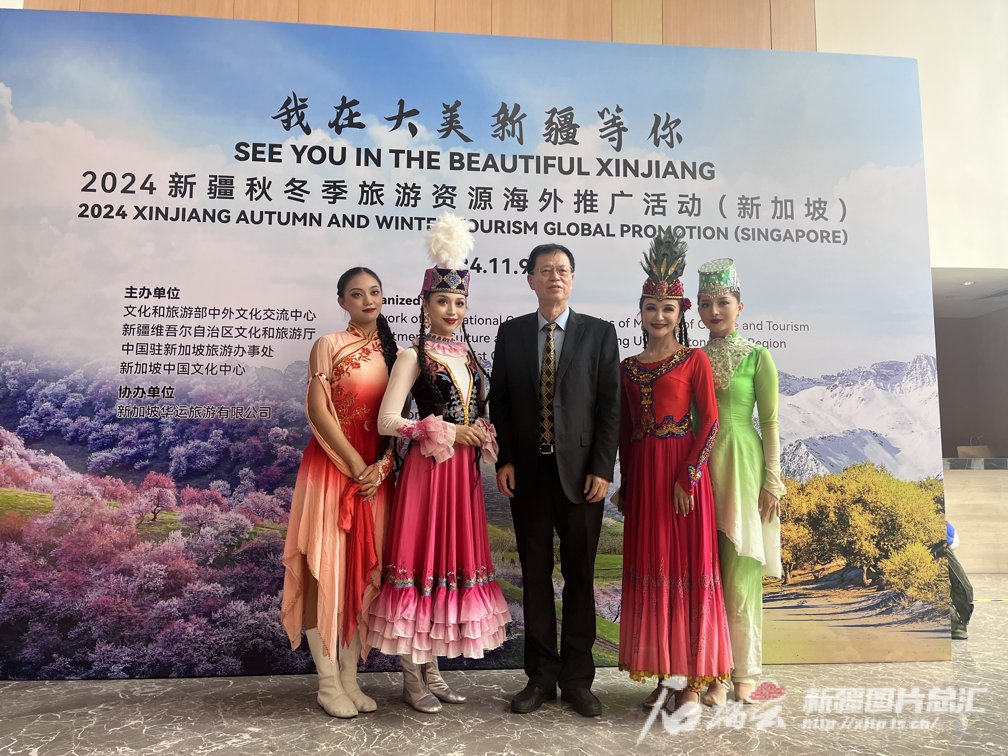 2024年11月初,2024新疆秋冬季旅游资源海外推广活动在新加坡举行,李良义(中)与新疆歌舞演员们合影。石榴云/新疆日报记者 王晶晶摄