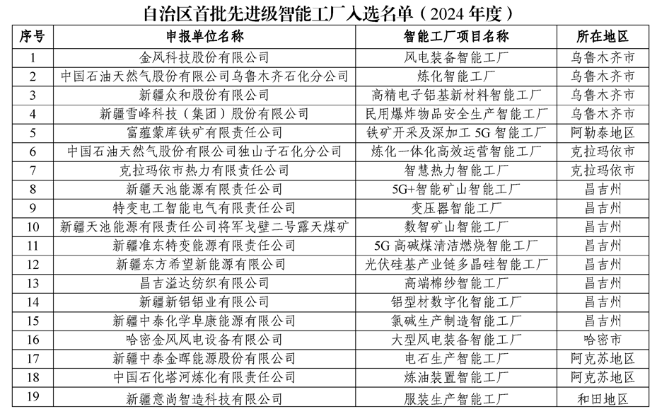 名单显示,共有19家单位入选自治区首批先进级智能工厂(2024年度),其中昌吉州8家,乌鲁木齐市4家,克拉玛依市、阿克苏地区各2家,阿勒泰地区、哈密市、和田地区各1家。
