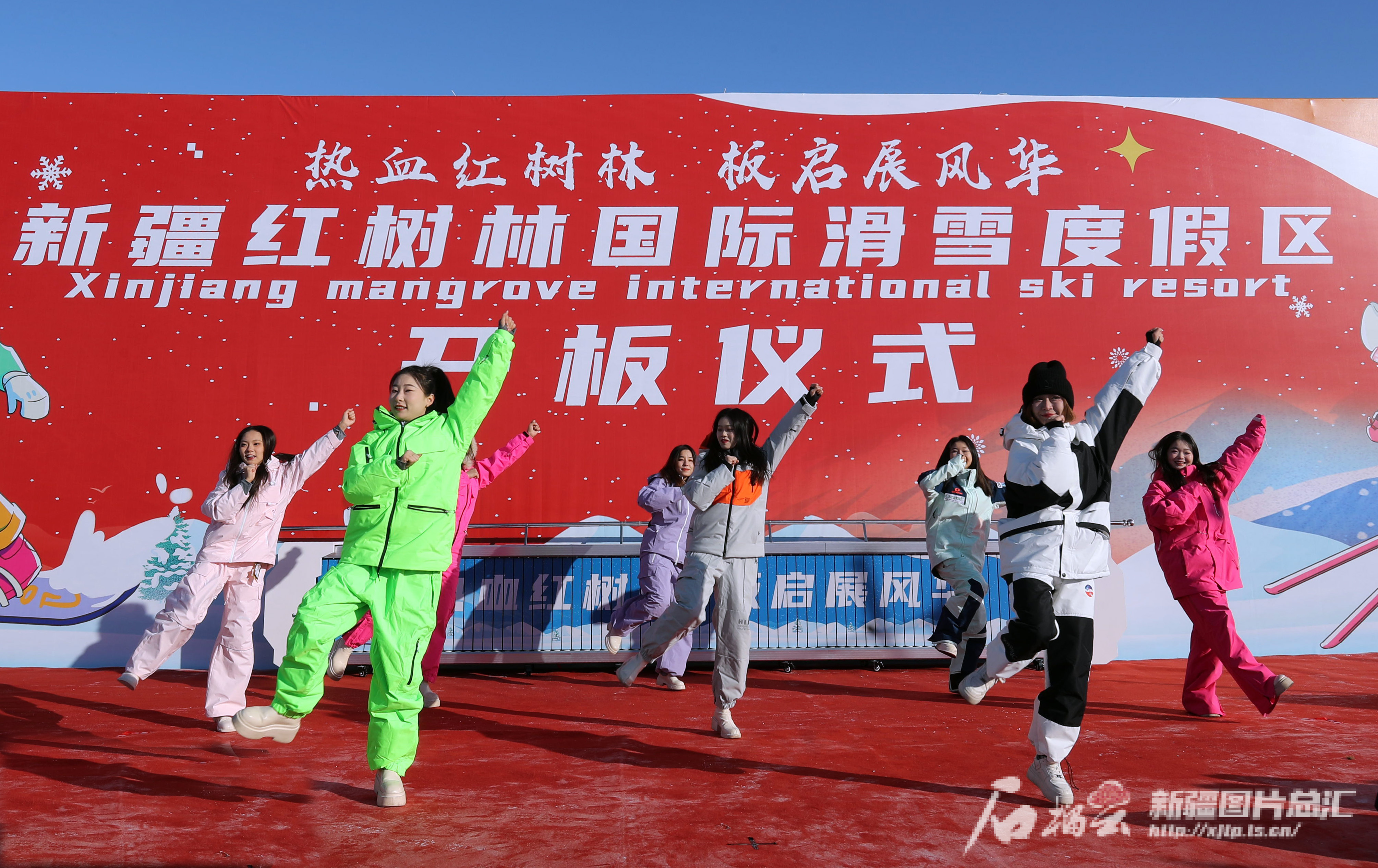 1月11日,新疆红树林国际滑雪度假区开板仪式上的雪服开场舞表演。