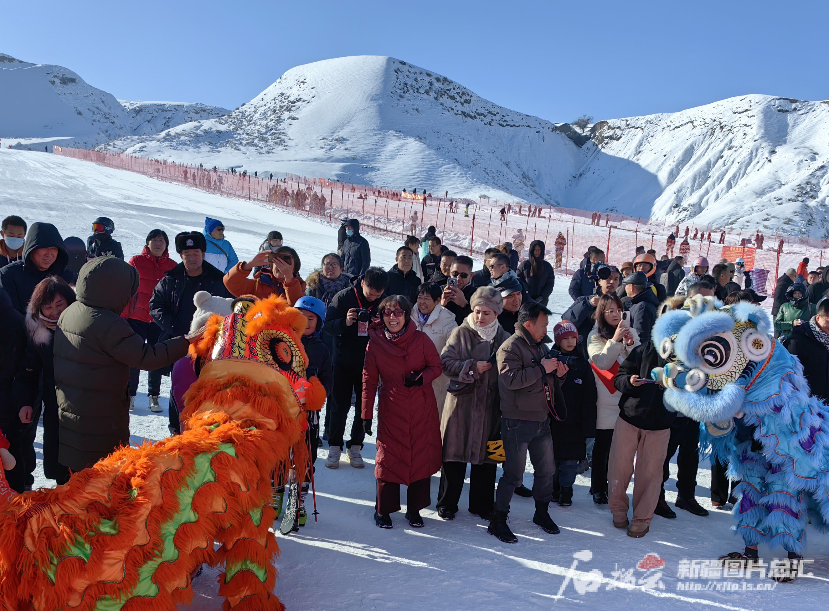 1月11日,新疆红树林国际滑雪度假区开板仪式上的舞狮表演。