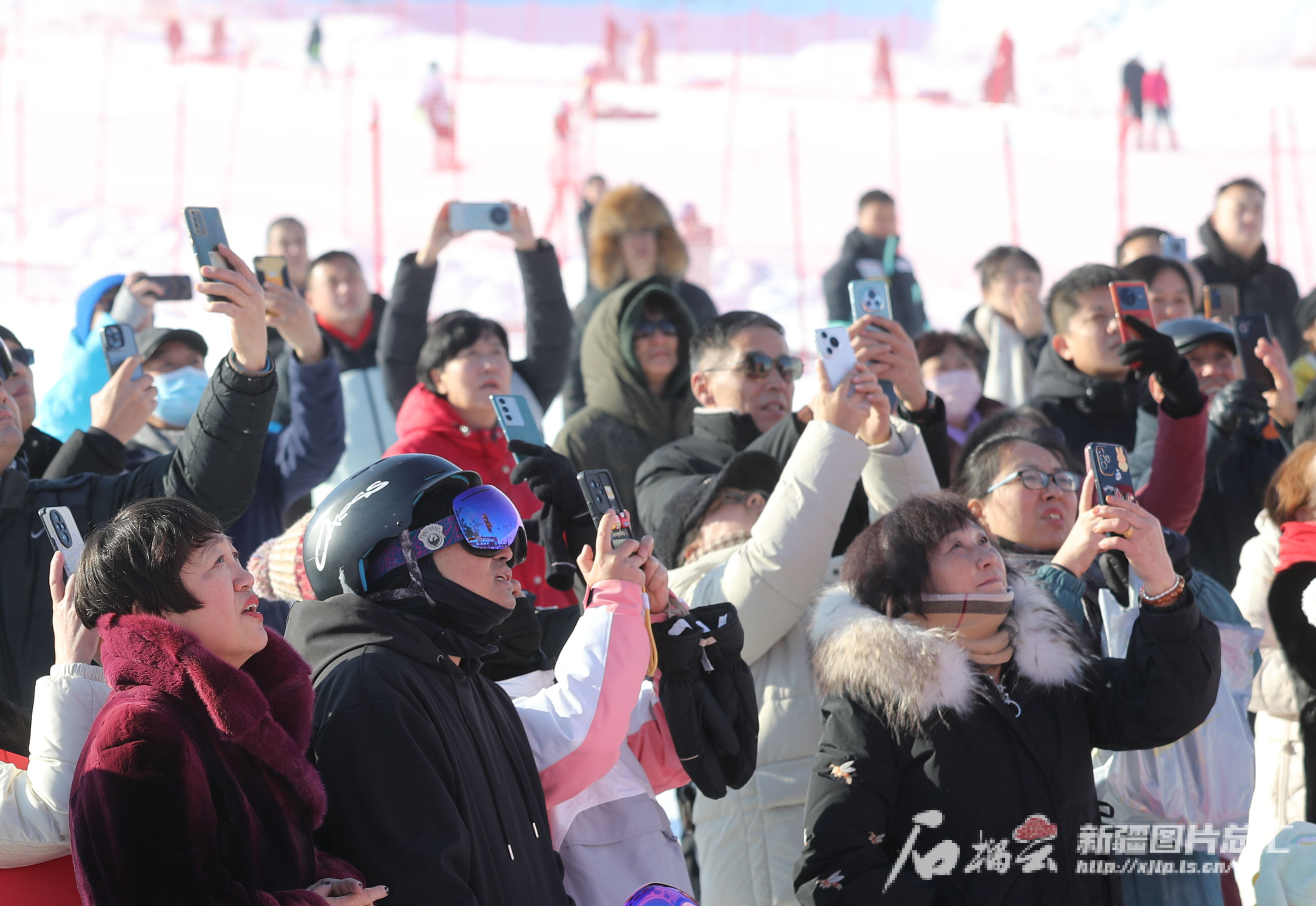 1月11日,新疆红树林国际滑雪度假区开板仪式现场,游客拍照打卡。