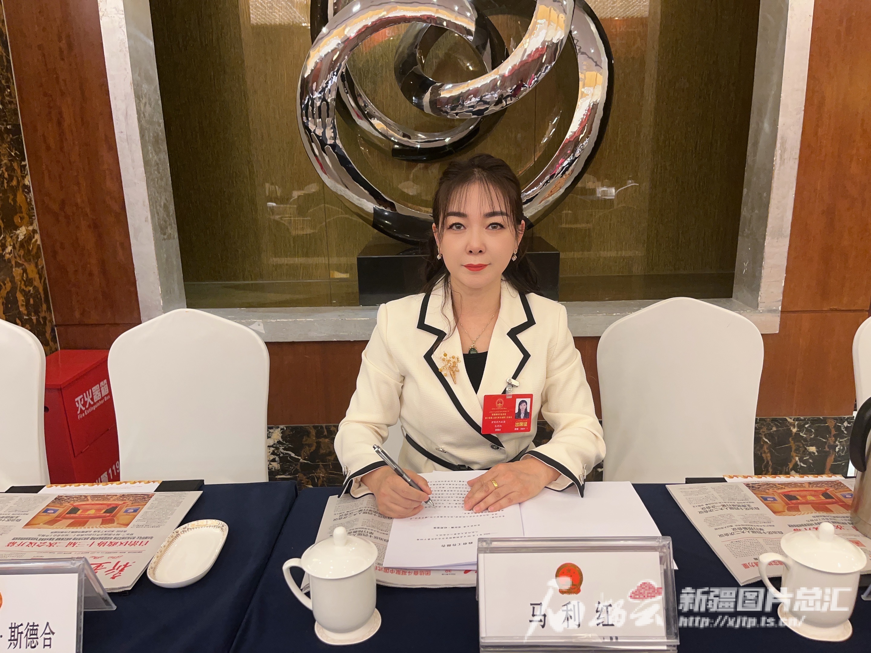 自治区第十四届人民代表大会第二次会议间隙,马利红拍照留念。本人供图