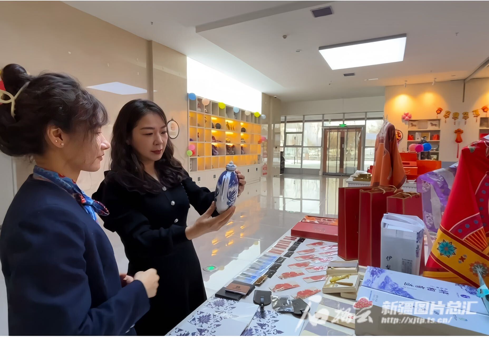 马利红(右一)正在看文创产品。本人供图
