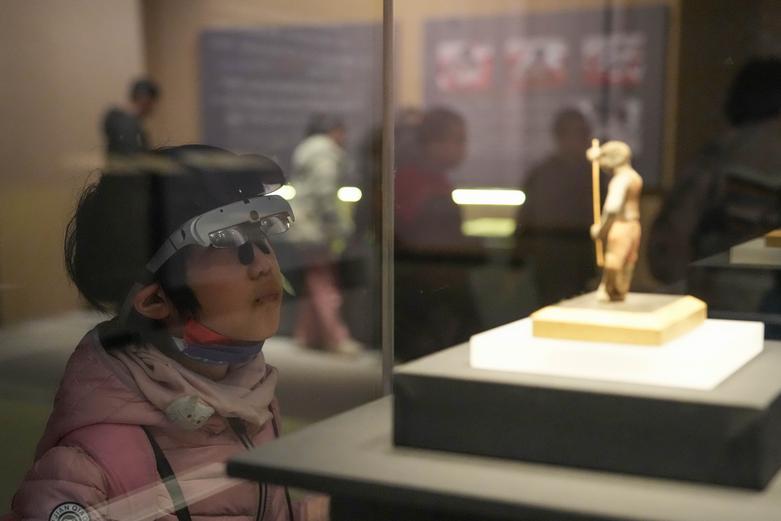 1月21日,观众在“聚宝之盆——新疆文物珍品展”观赏鸡首人身俑(复制品)。 新华社记者 薛宇舸 摄