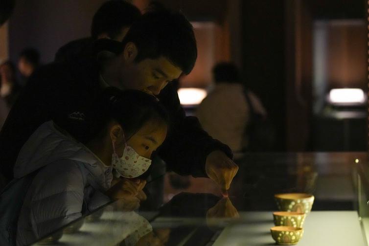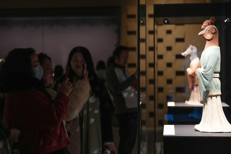 1月21日,观众在“聚宝之盆——新疆文物珍品展”观赏黑人百戏俑。 新华社记者 薛宇舸 摄