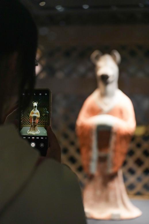 1月21日,观众在“聚宝之盆——新疆文物珍品展”拍摄猪首人身俑(复制品)。 新华社记者 薛宇舸 摄