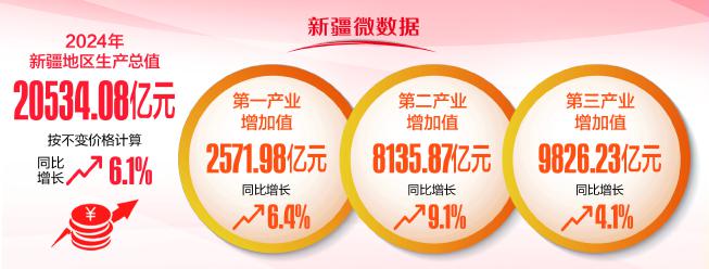 2024年,新疆地区生产总值中,第一产业增加值2571.98亿元,同比增长6.4%;第二产业增加值8135.87亿元,同比增长9.1%;第三产业增加值9826.23亿元,同比增长4.1%。