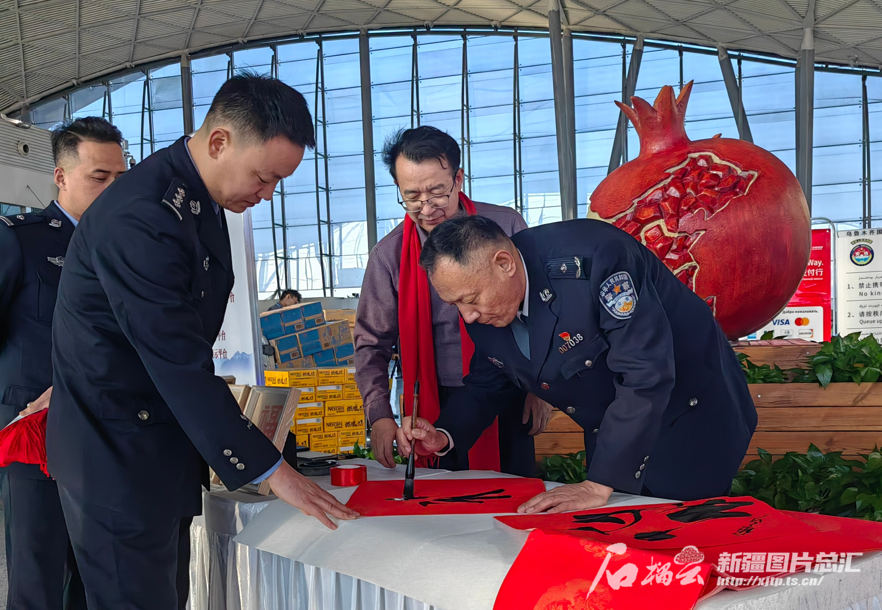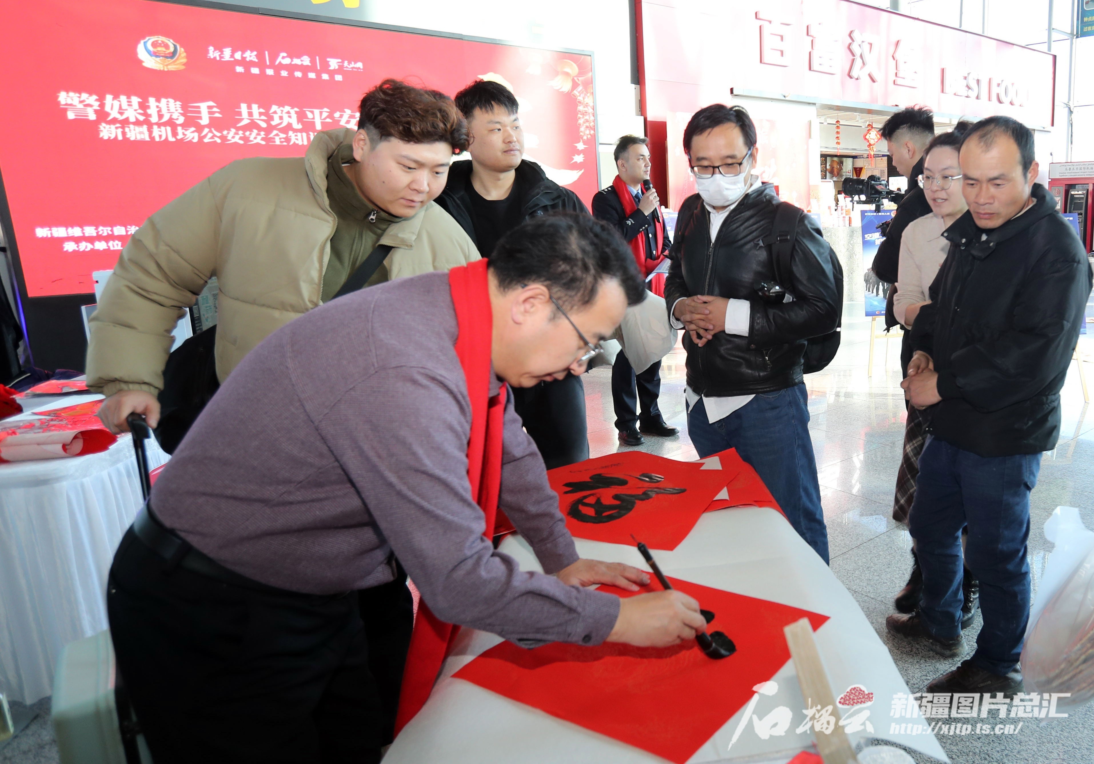 1月26日,“警媒携手共筑平安空港”新疆机场公安安全知识宣传活动现场,书法家为旅客写“福”字。