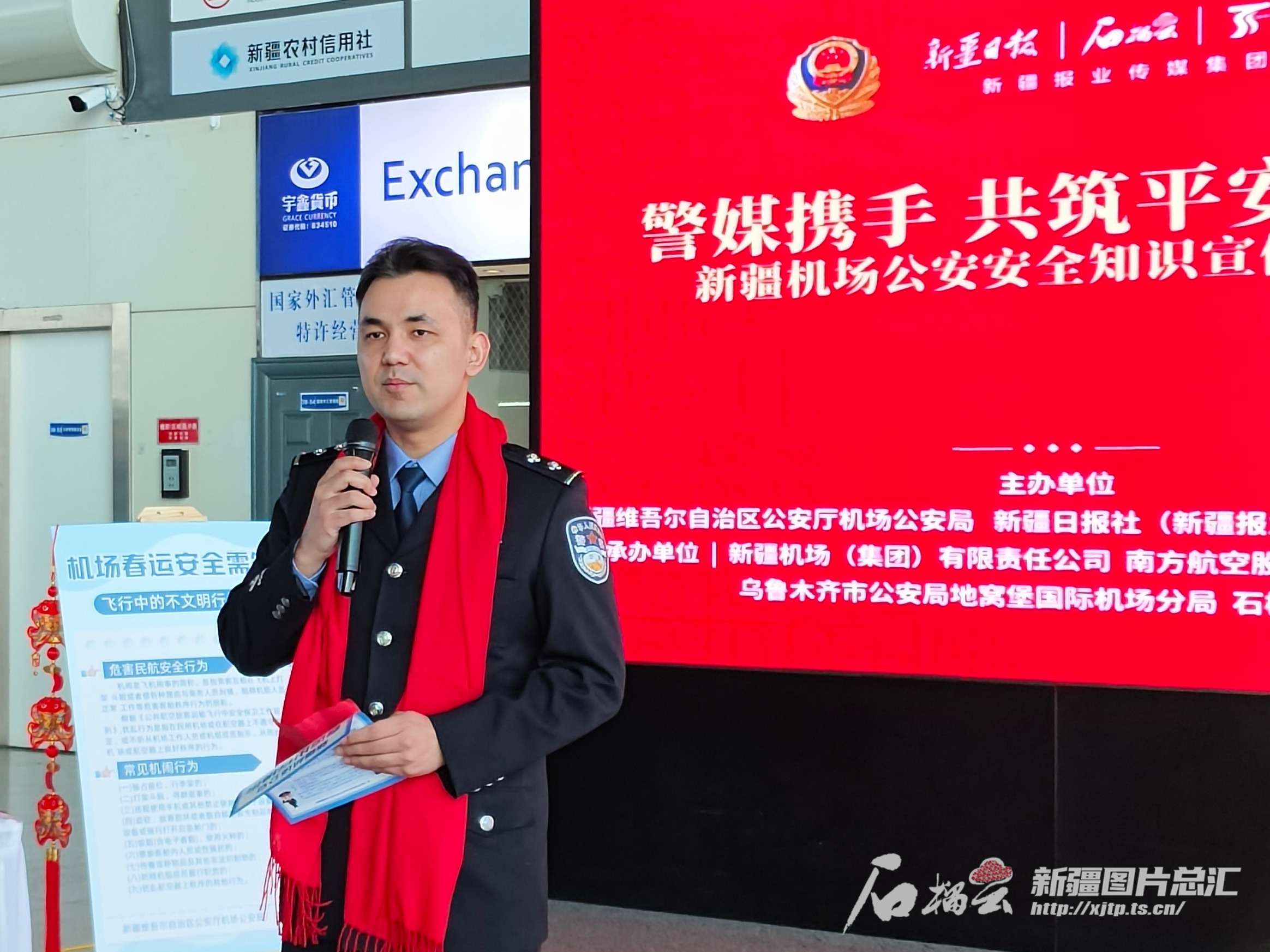 1月26日,“警媒携手 共筑平安空港”新疆机场公安安全知识宣传活动现场,自治区公安厅机场公安局宣传民警艾力坎木·艾尼瓦尔现场开展安全出行有奖问答。