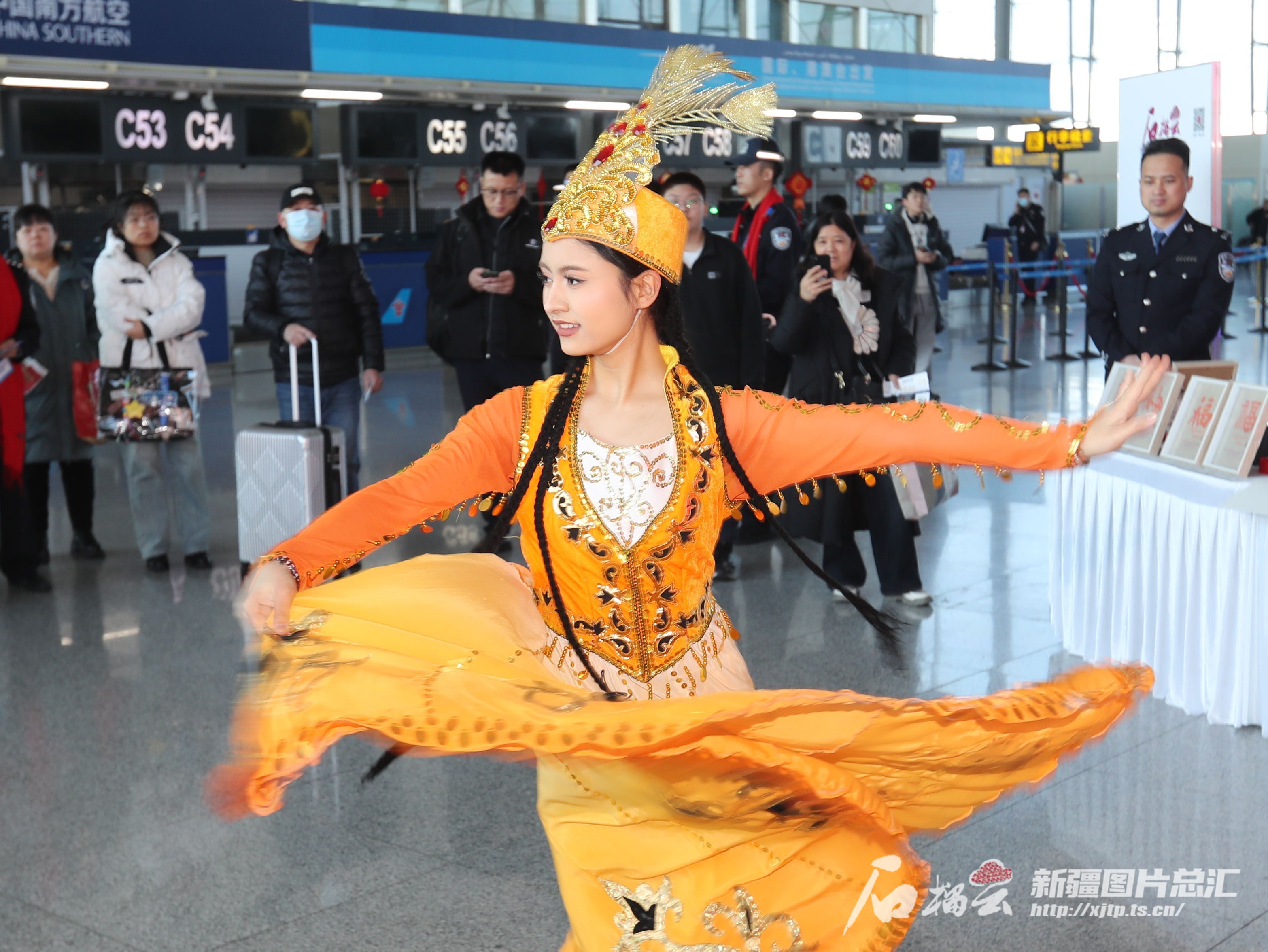 1月26日,“警媒携手 共筑平安空港”新疆机场公安安全知识宣传活动现场,新疆大学学生麦迪娜·阿布力孜表演独舞《56个民族是一家》。