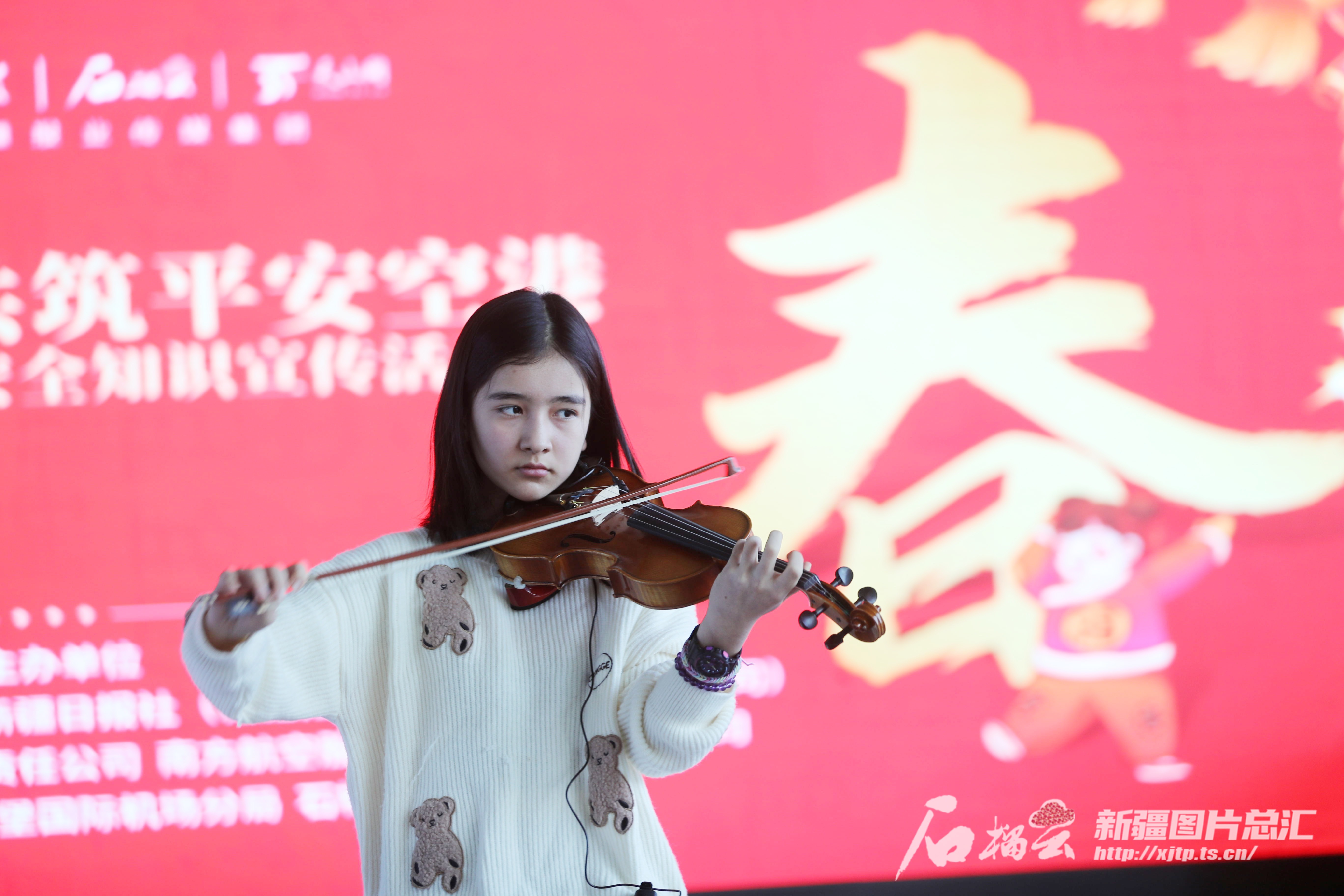 1月26日,“警媒携手 共筑平安空港”新疆机场公安安全知识宣传活动现场,乌鲁木齐市第十五小学学生阿依努尔·艾赛尔丁为现场观众带来精彩的小提琴独奏《雪的华尔兹》。