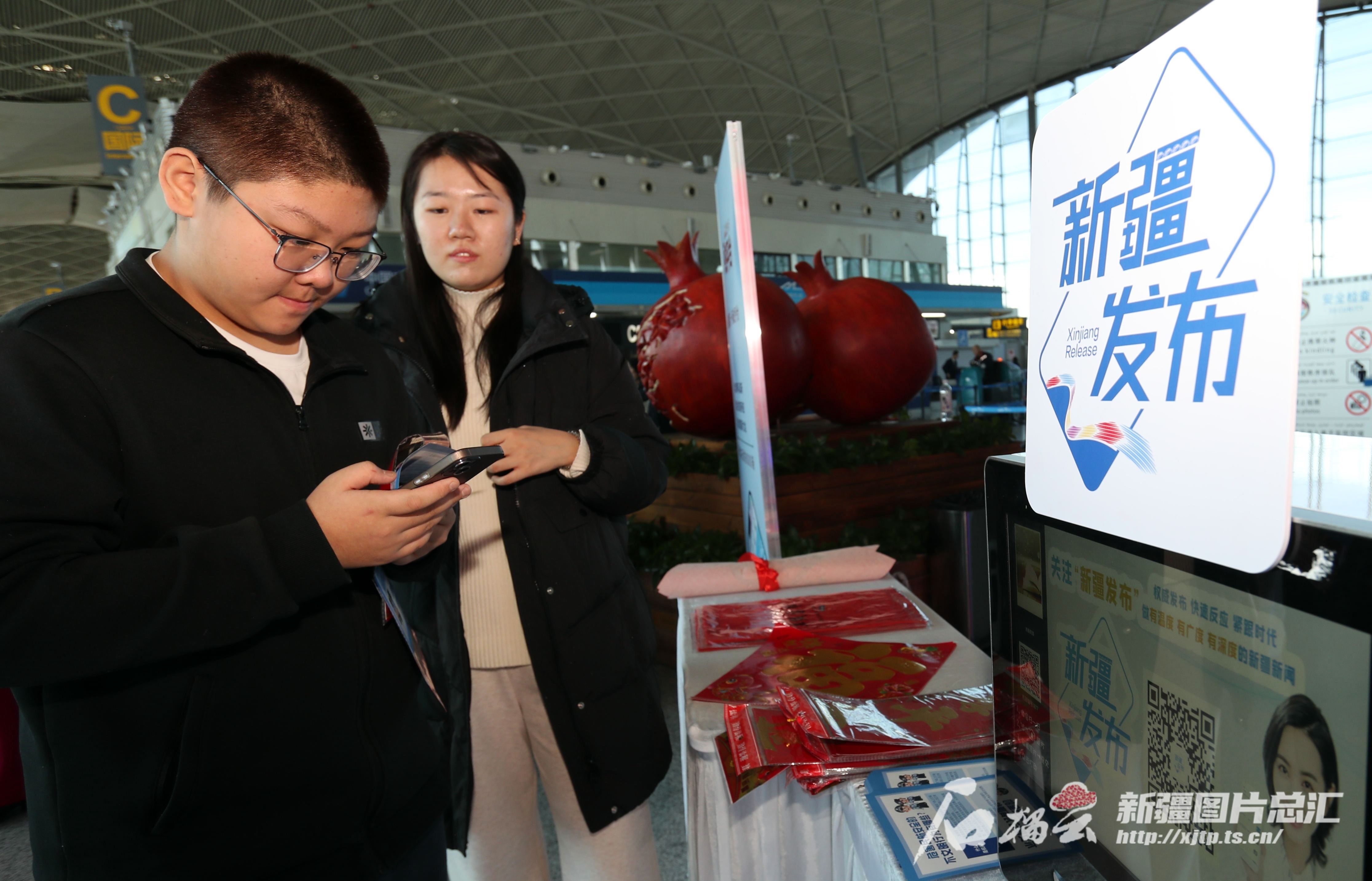 1月26日,“警媒携手共筑平安空港”新疆机场公安安全知识宣传活动现场,旅客扫码领取“福”字。
