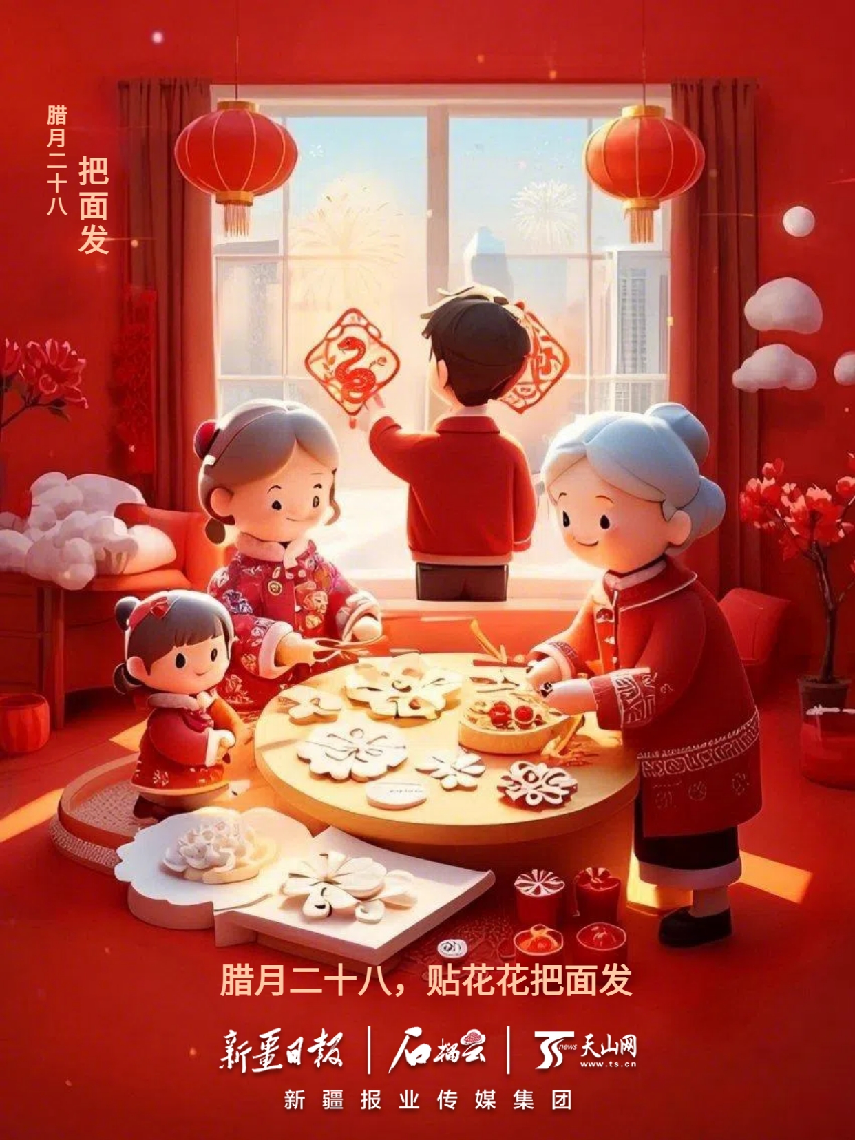 “腊月二十八,打糕蒸馍贴花花”,人们会在这天把面发好,各家各户开始准备初一到初五的主食。“八”与“发”谐音寓意发财,人们希望把面发好了,来年可以财源滚滚、财运亨通、招财进宝。除了“打年糕”“蒸花馍”,还有一个重要的习俗,就是“贴窗花”,窗花一贴,红红火火的喜气不请自来,年味也就更浓了。