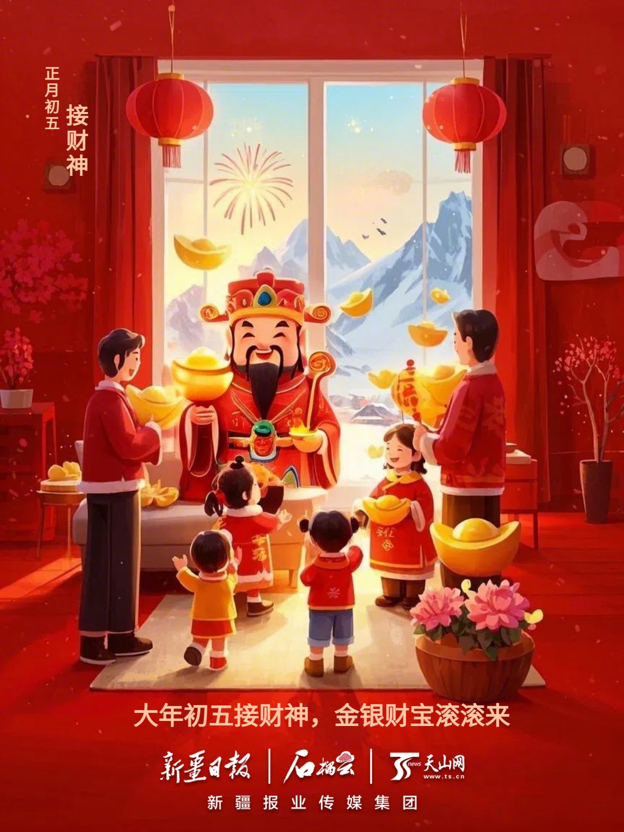 “正月初五,迎财神”,民间传说正月初五是财神的生日,家家置办酒席,为财神贺辰。这一天,大家还要吃饺子,饺子捏成元宝形状,寓意“健康长寿”,红红火火过大年!