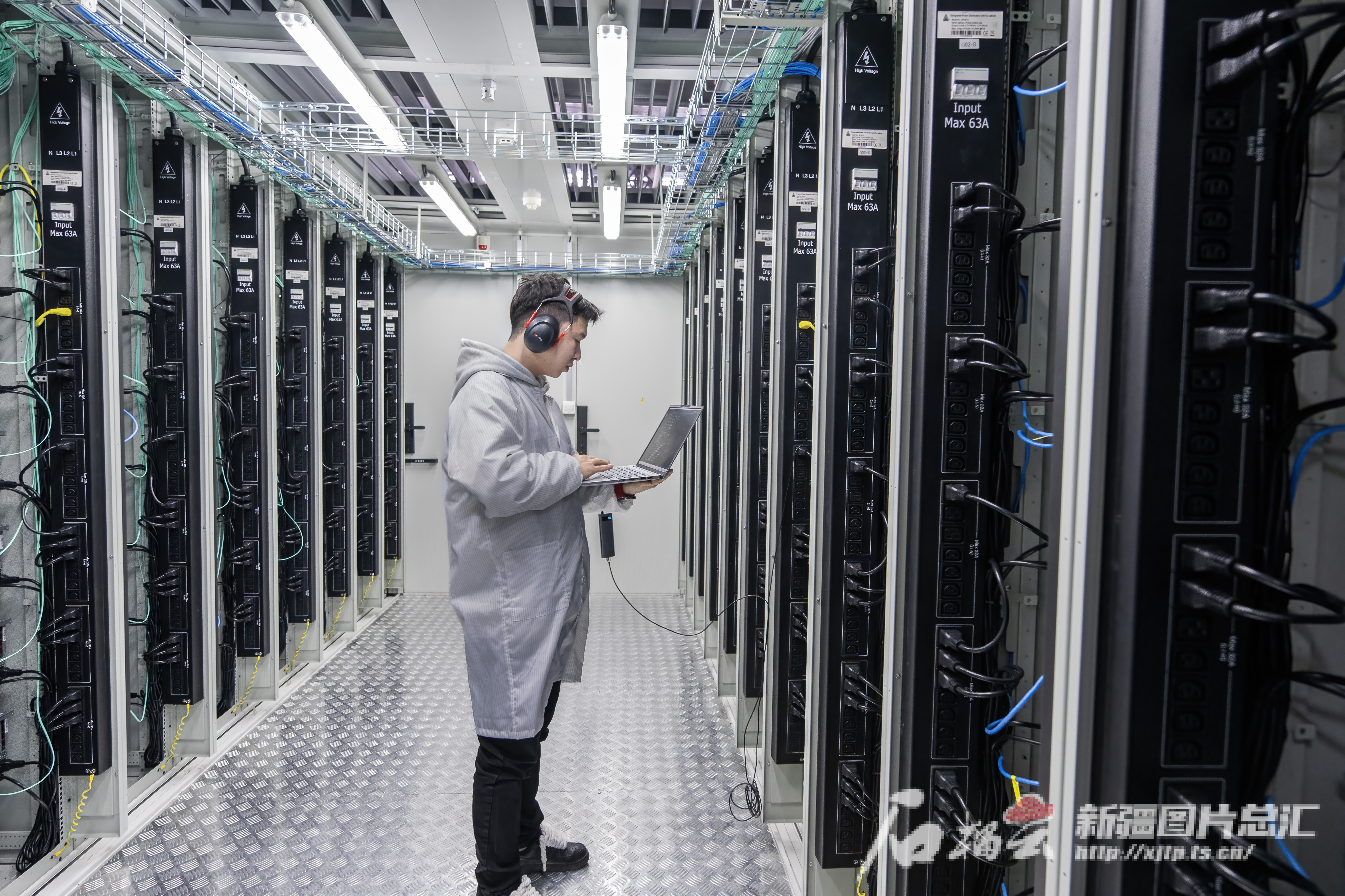 2月11日,在新疆克拉玛依云计算产业园区,新疆克融云算数字科技有限公司(“丝路新云”绿色算力中心)技术人员在数据机房巡查设备运行情况。闵勇摄