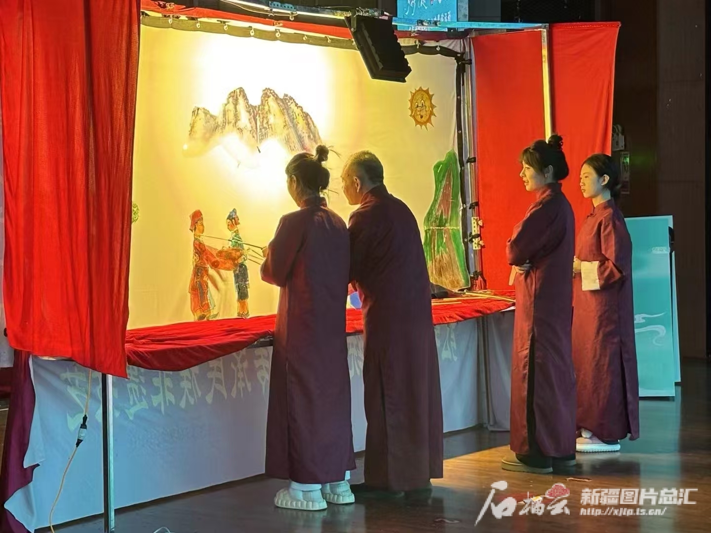 郭同心(左二)和学生们一起演皮影戏。本人供图