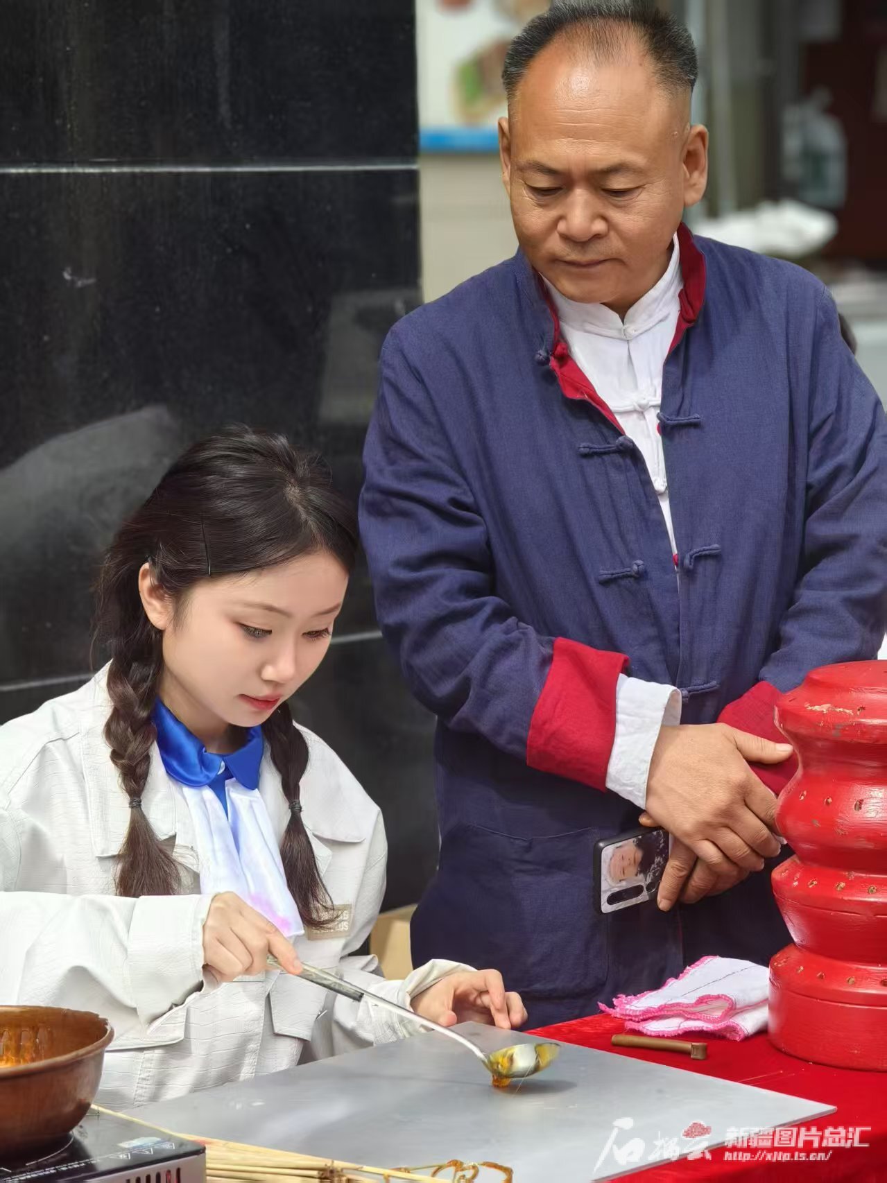 郭同心(右)指导学生做糖画。本人供图