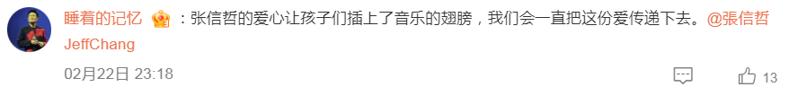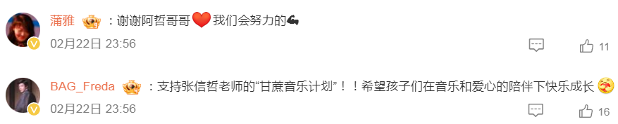 网友“下雪边界遇见你”留言:8年来,张信哲老师用实际行动推进“甘蔗音乐计划”的落实,这项计划不是传统意义上的公益,而是音乐与公益的温情融合,在阿哲的影响下,许多粉丝也在默默参与,为计划贡献一份力量。 点点微光,相互辉映,愿“甘蔗”的甜和音乐的“暖”,陪伴孩子们在追梦的路上快乐成长。