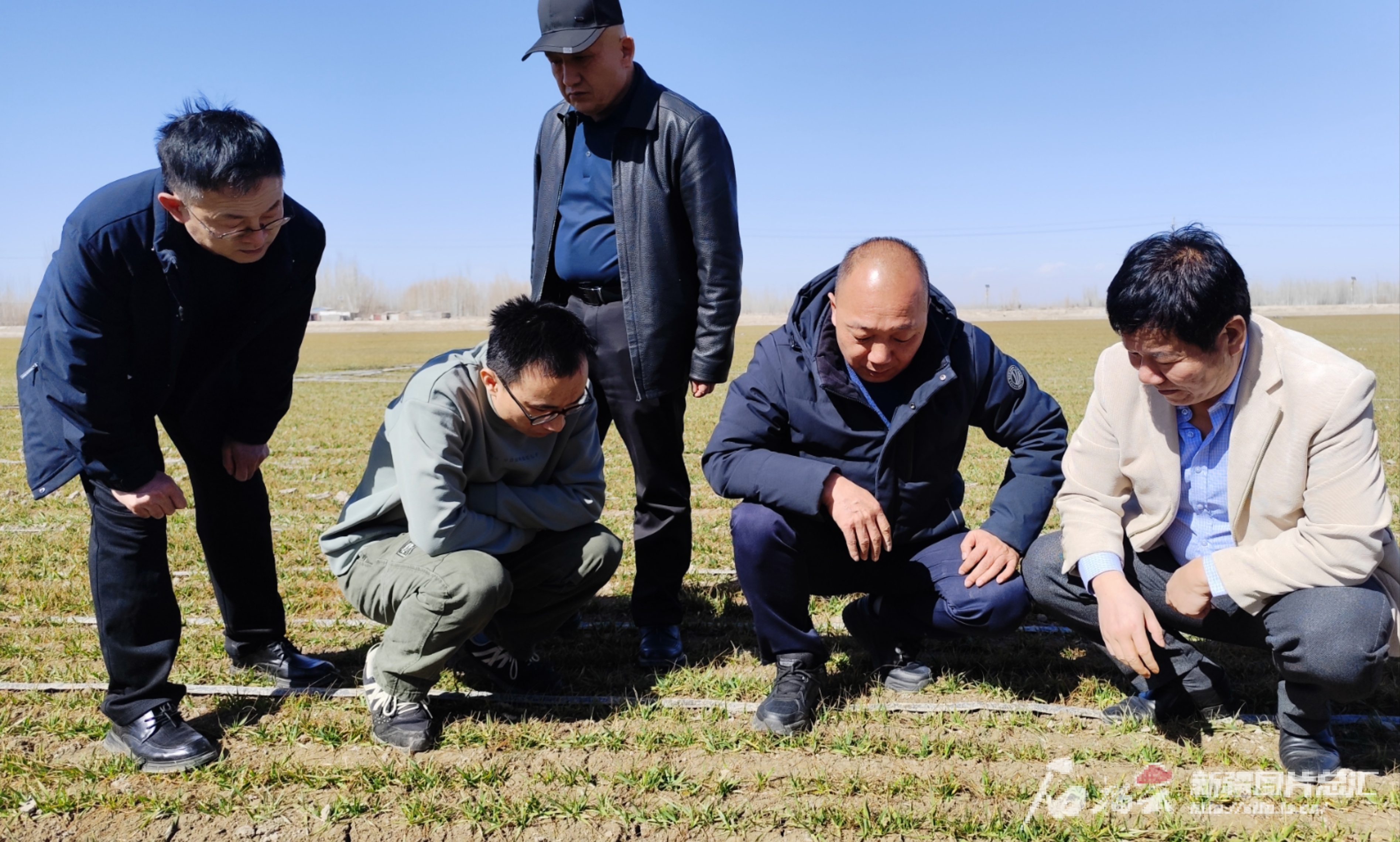 3月8日,自治区粮油糖作物大面积单产提升科技支撑工作推进会期间,与会专家查看疏勒县冬小麦返青苗情。石榴云/新疆日报记者 刘毅摄