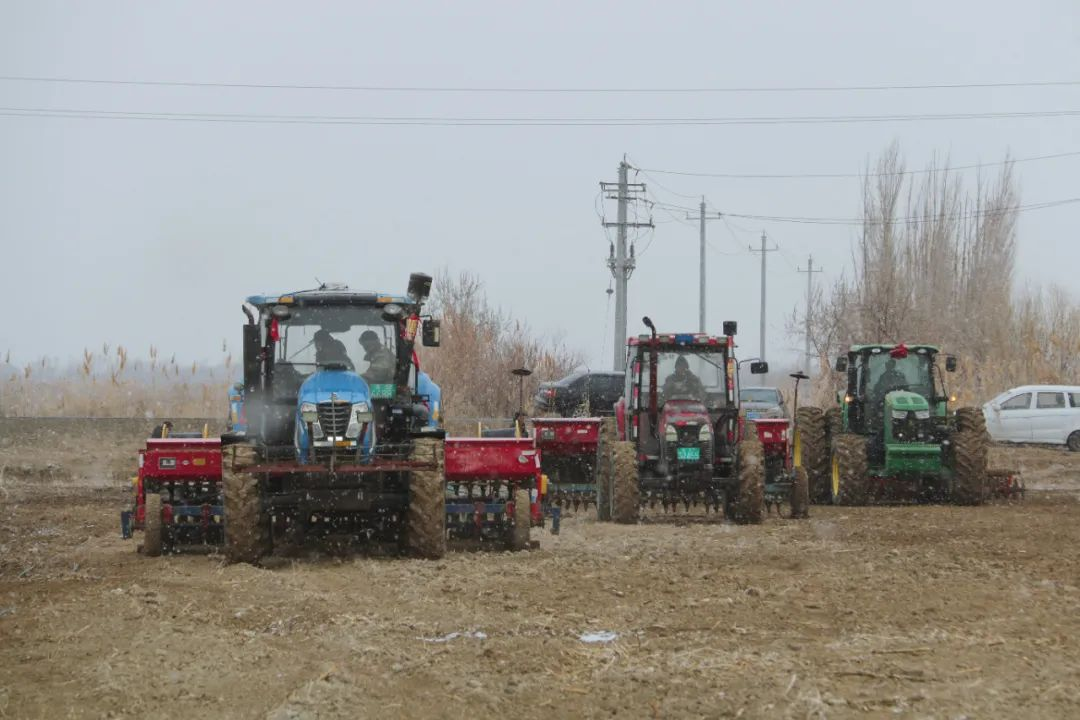 在阿合其农场五台社区种植户家杨成伍的260亩农田,机械声隆隆作响,装载着北斗导航的小麦播种机在田间来回穿梭,一粒粒小麦种子被陆续播撒进地里。伴随着播种机的阵阵轰鸣声,播种、覆土、平整等工序一次性完成。