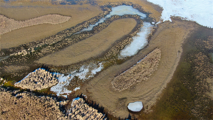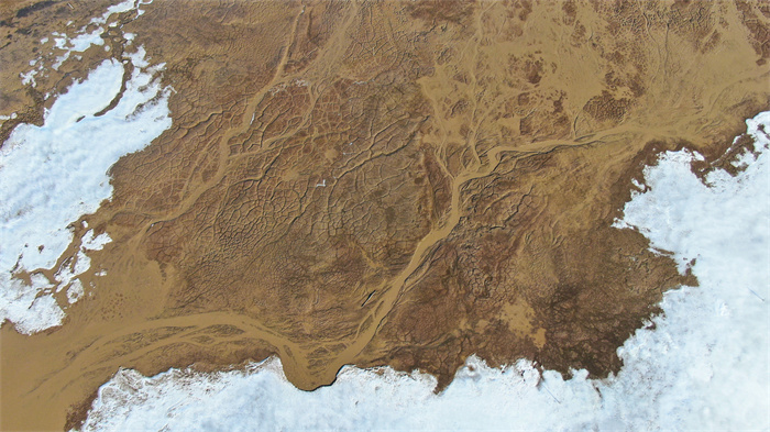 3月,春风剪开冬日封冻,新疆伊犁哈萨克自治州新源县那拉提国家湿地公园成了大自然的画布,初融雪水似流动画笔,在纵横河道、广袤滩涂绘出奇妙纹理,或深或浅,像蜿蜒水墨,又似抽象几何。每一道褶皱、每一条曲线,都是季节更迭留下的细腻笔触,书写着独属于春日的诗篇。